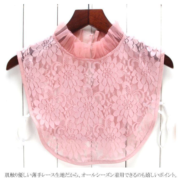 コーデにちょっぴり甘いテイストをプラスする総レース付け襟。ふんわりとしたフリルネックと花模様レースが大人女性の可愛さをアピール。肌触り優しい薄手レース生地だから、オールシーズン着用できるのも嬉しいポイント。サイドにはアジャスター付きゴムバンドが施され、お体に程よくフィットし、ズレにくい。ラウンドネックのパーカーやニットトップスなどに合わせるだけでお洒落なレイヤードコーデが楽しめます。
