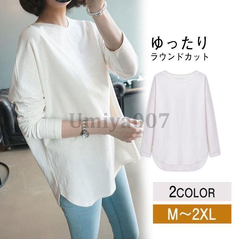 ロングTシャツ レディース カットソー 黒 白 ゆったり ラウンドカット 無地 長袖 トップス クルーネック ロンT やわらか ゆるTシャツ