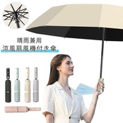 【晴雨兼用涼風扇風機付き傘】傘の内側に小型のファンを搭載した、扇風機付き日傘です。近い距離で真上から風があたるので、汗をかいた頭や顔に風があたると気化熱でしっかりと冷やしてくれます。