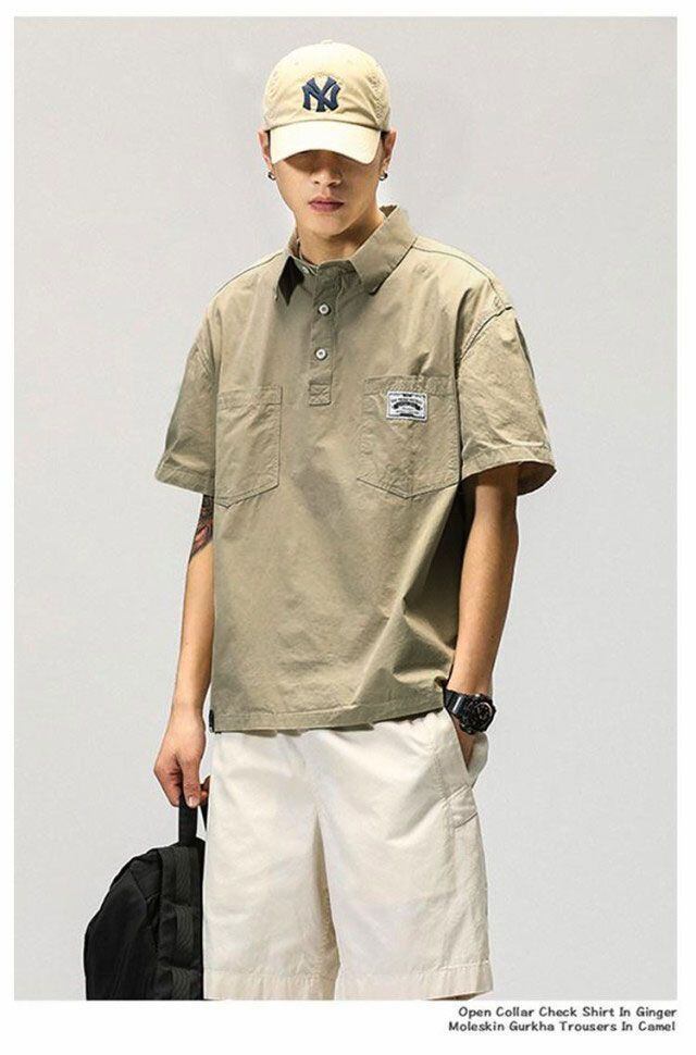 新品 オーバーサイズ ビッグシルエット トップス リラックス カジュアル メンズ カジュアル ミリタリーシャツ プルオーバー ハーフボタン ポロシャツ ポケット付 シンプル ゆったり ス kkkqyd | オキナ商店