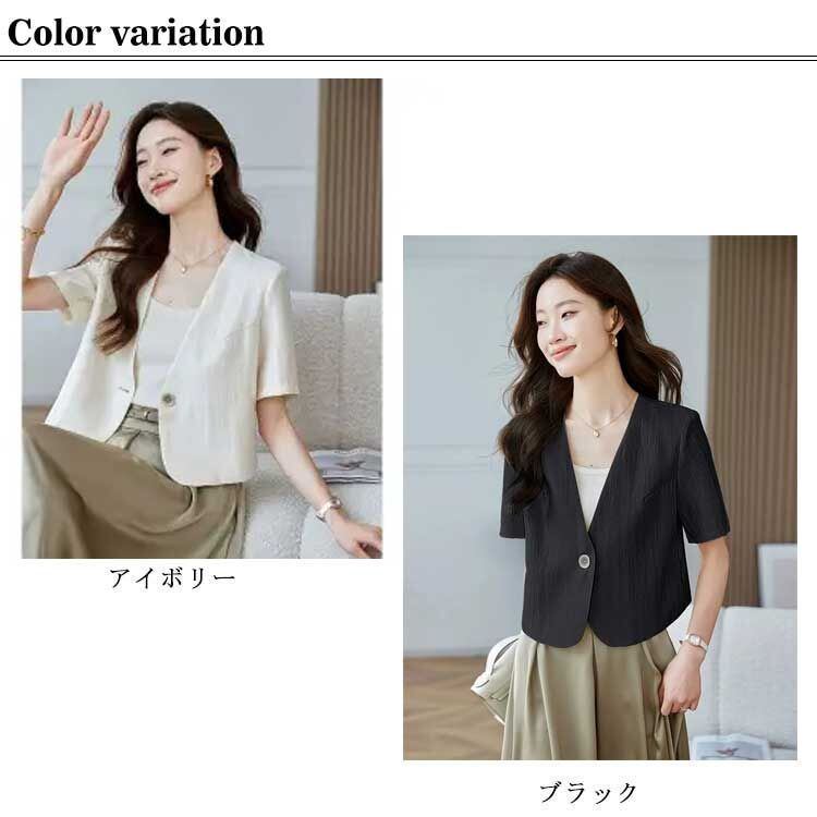 新品 サマージャケット 半袖ジャケット 夏 ノーカラージャケット 上品 ショート丈 トレンド スーツジャケット ワンボタン 通勤 オシャレ オフィスカジュアル きれいめ 羽織り 無地 シンプル kkkgzs | オキナ商店