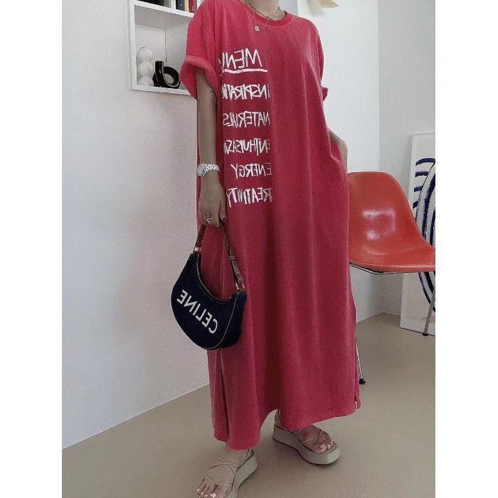 新品 Tシャツワンピ ロングワンピース 半袖 英字プリント レディース クルーネック ワンピース 夏 ロング丈 マキシワンピース スリット入り カジュアル 体型カバー 着痩せ マタニティ ゆったり 肌触り 柔らかい 楽ちん kkkmds | オキナ商店