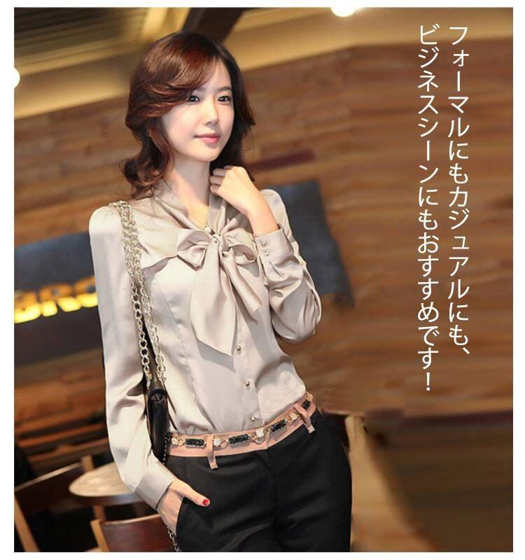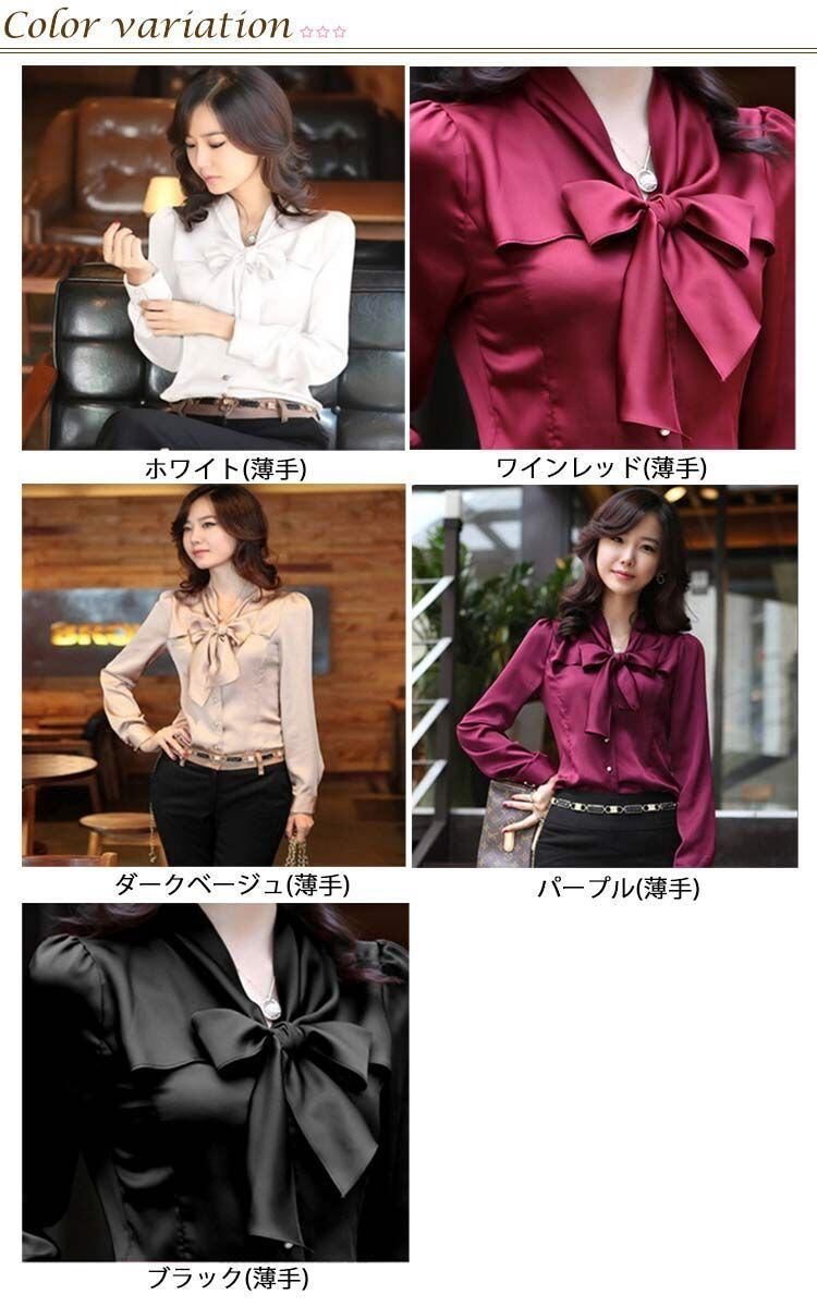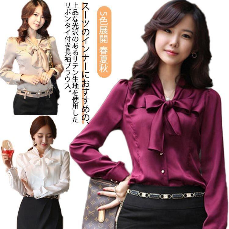新品 5色展開 ブラウス 長袖 レディース フォーマル サテンタッチ シャツ ボウタイ 光沢感 春夏秋 ふんわり 無地 きれいめ スリム おしゃれ リボンタイ オフィス スーツインナー 通勤 OL kkkcmn | オキナ商店