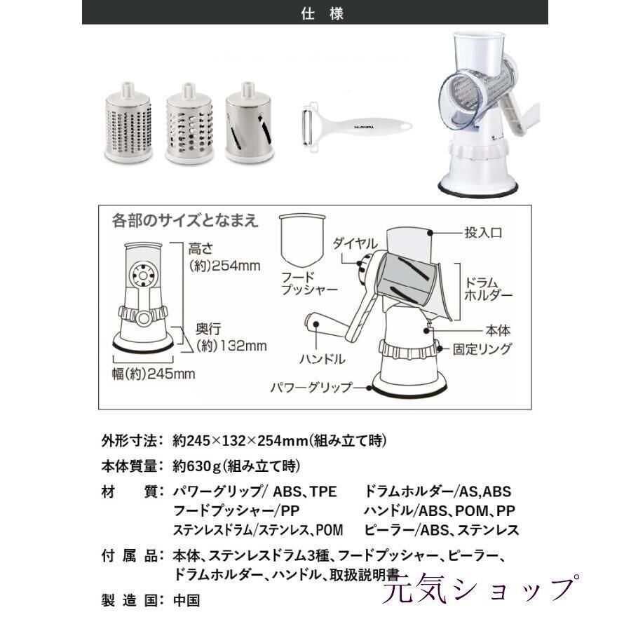 使い方は簡単、ステンレスドラムを付けてハンドルを回すだけ。3つのドラムを付替えれば、3通りの食材のカットが可能です。