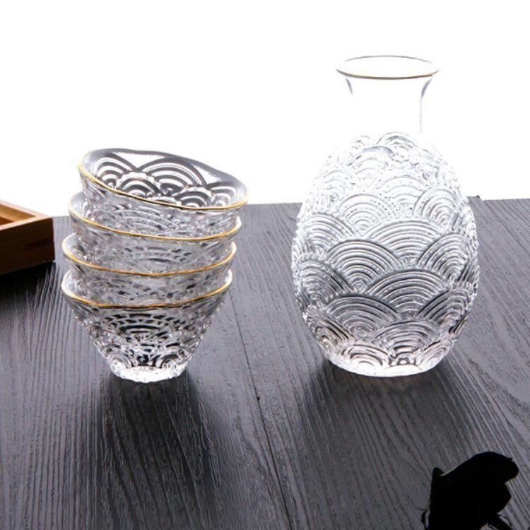 新品 徳利 おちょこ セット ガラス 6点セット 波模様 お猪口 クリア 透明 酒器 日本酒 和酒 冷酒 温め 焼酎 盃 杯 とっくり 熱燗 ぬる燗 ぐい呑み ゴールドライン 和風 北欧 おしゃれ グラデー kkkttz | オキナ商店