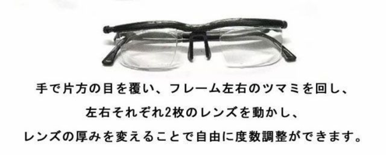 手で片方の目を覆い、フレーム左右のツマミを回し、左右それぞれ2枚のレンズを動かし、レンズの厚みを変えることで自由に度数調整ができます。