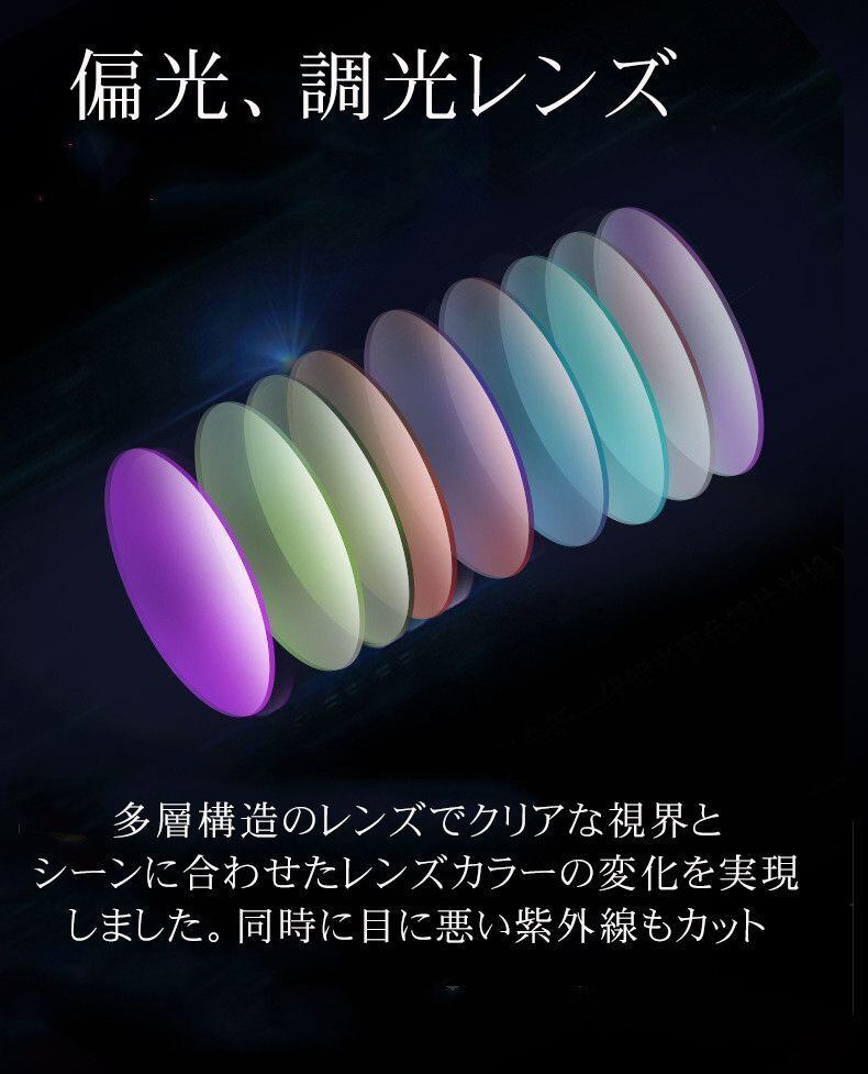 【多用途】一枚サングラスで三つ機能で、【●夜間増光●快速調光●偏光】一年中どんな気候でも利用でき、昼だけではなく、夜でも視野がクリアに、様々なところに適当で、例えば:雨の日、曇りの日、ゴルフ、野球、ランニング、自転車、山登り、旅行、野球、路面、水面、雪面からの照り返し、運転やドライブ、釣り、バイク、トンネルでも、夜の対向車のヘッドライトのまぶしさが防げなどにピッタリです。●●●●●運転時注意こと:このサングラスが紫外線を監視したら、レンズの色がグレーに変わり、自動車のガラスは紫外線を遮る機能があるため、太陽天気で、運転したら、レンズが変色しません。