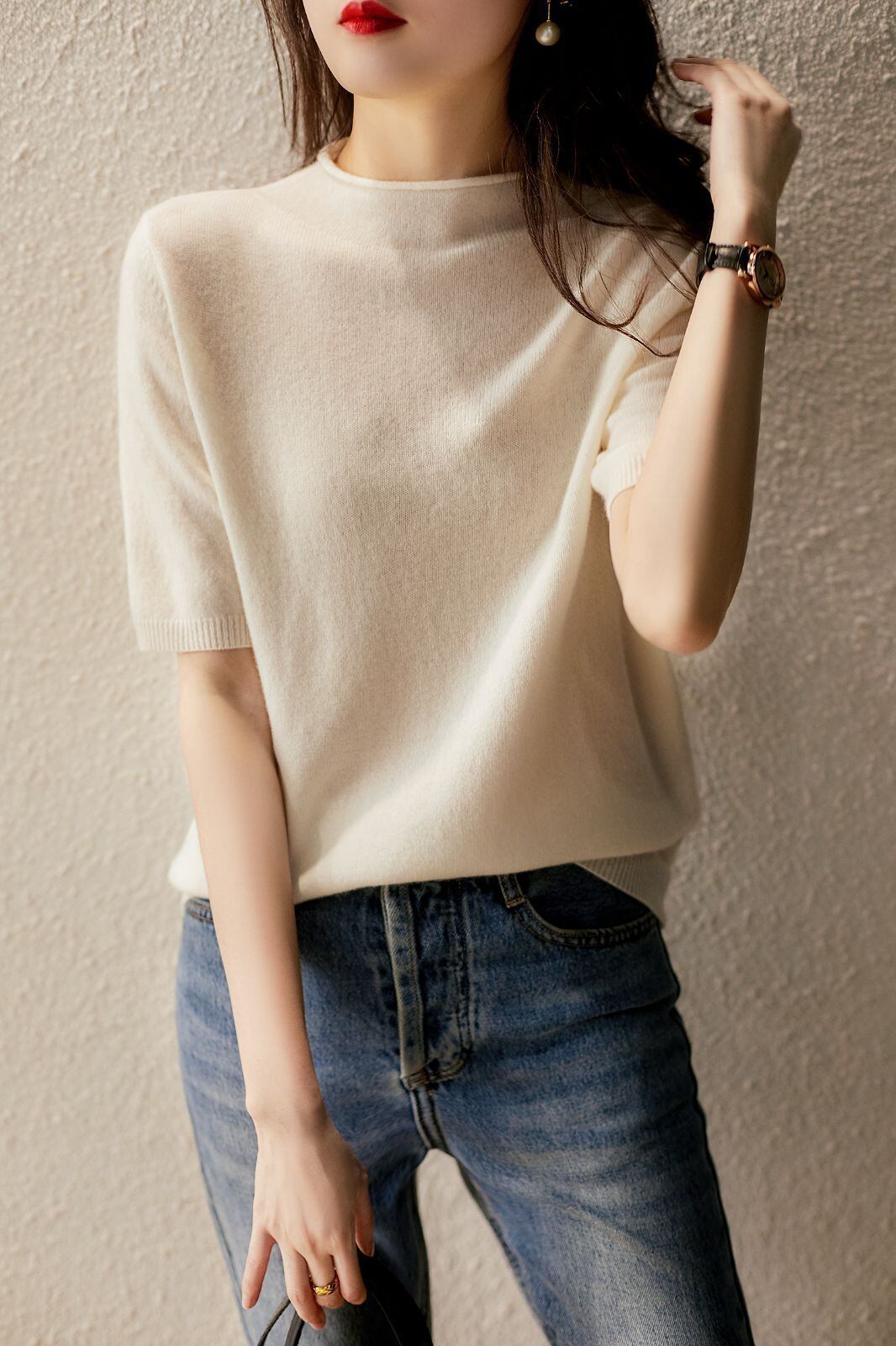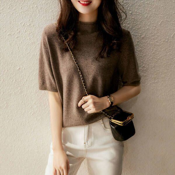 新品 ニット 二の腕カバー Tシャツ 五分袖 カットソー 半袖 サマーニット ハイネック トップス 半袖ニット シンプル 涼しい 冷房対策 きれいめ オフィス カジュアル 20代 30代 40代 kkkbqh | オキナ商店