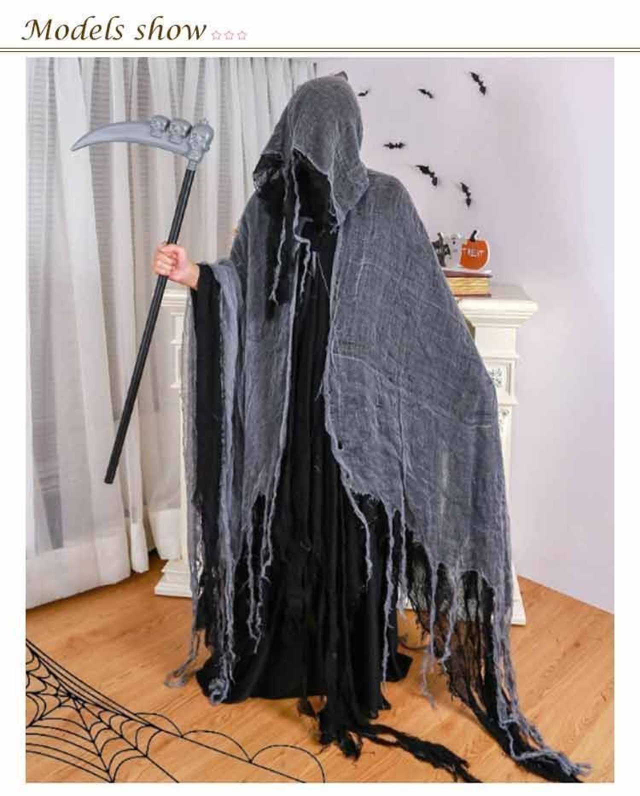 マントを着てベールを被るだけで、死神コスプレの完成です。素材は透けないしっかりとした生地で、安心してご着用いただけます。