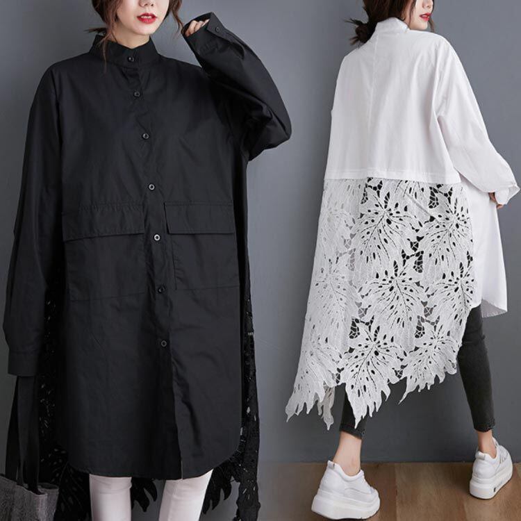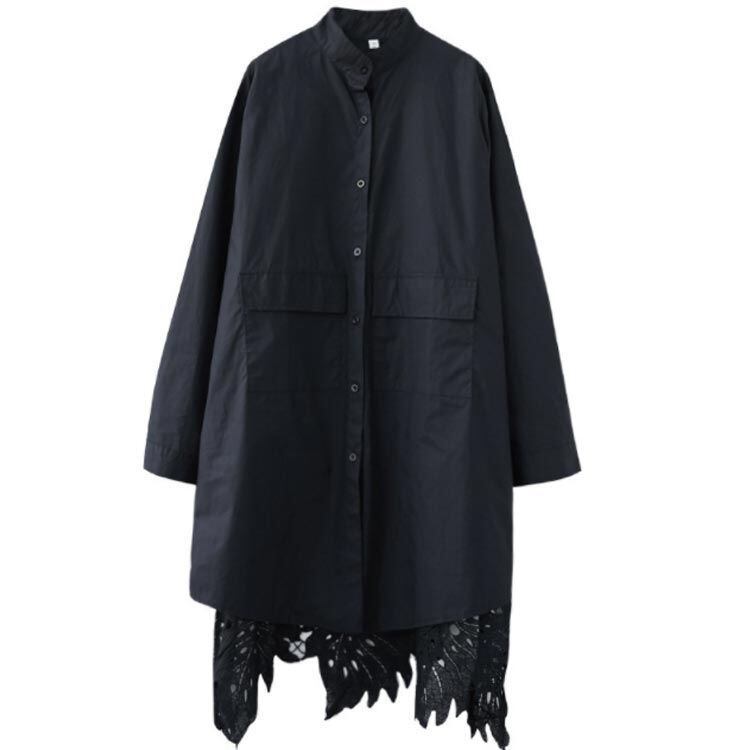 新品 バックレース透かし編み 長袖 チュニック ロングシャツ 切り替え シャツ レディース バックレース透かし編み トップス ブラウス 羽織り 春 秋 大きいサイズ ルーズ カジュアル ブラック kkkxvh | オキナ商店