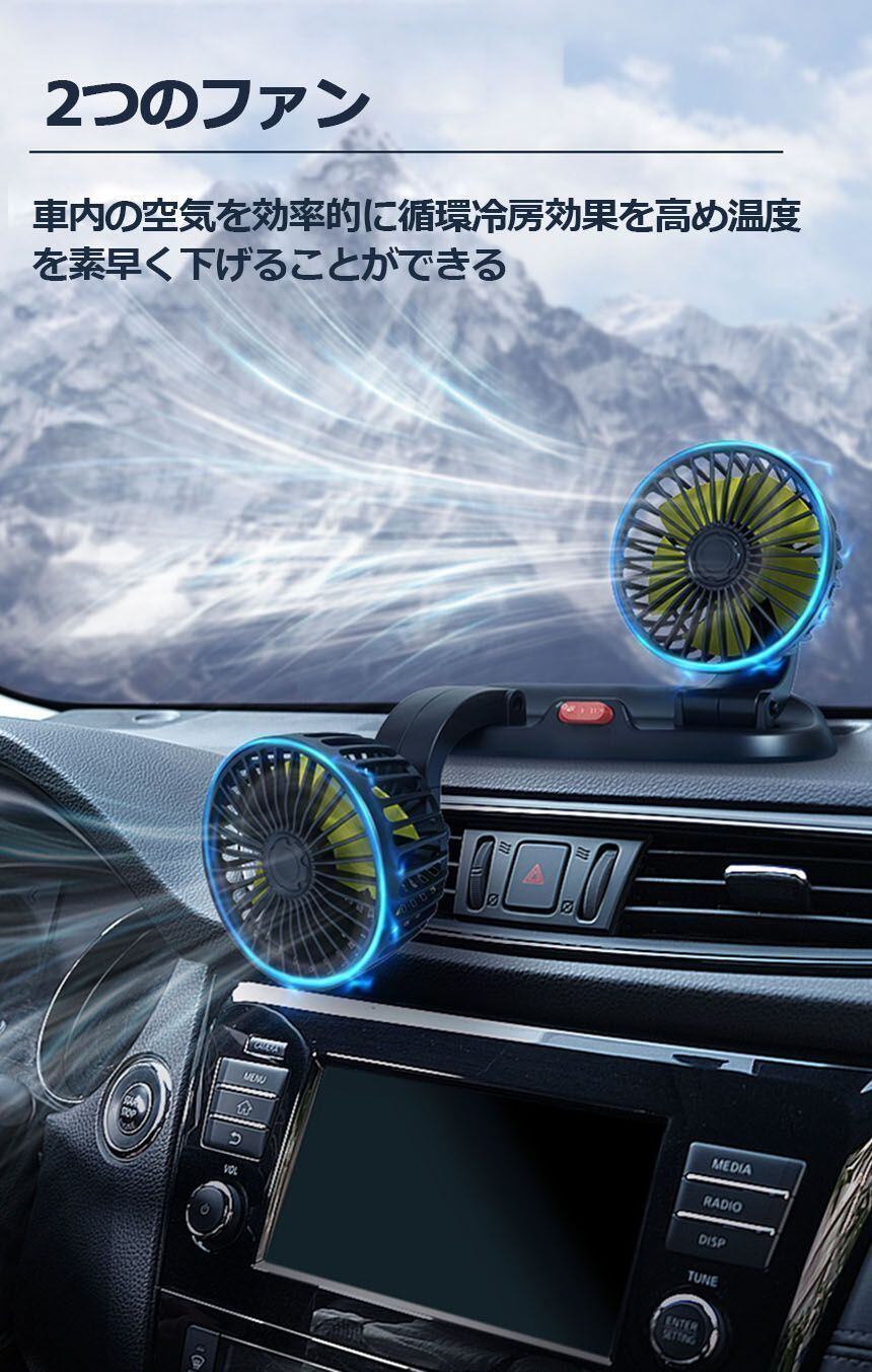 【角度調整可能&風量調節】12v/24vタイプには2段階調節可能、USB式にはには3段階調節可能左右各自に前後180度、左右360°角度調整可能ですのでとても便利です