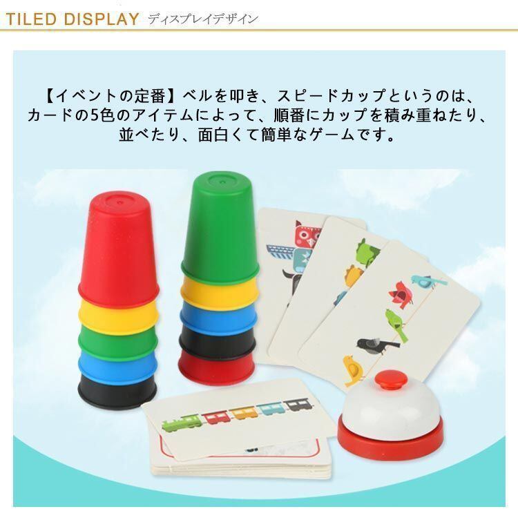 【イベントの定番】ベルを叩き、スピードカップというのは、カードの5色のアイテムによって、順番にカップを積み重ねたり、並べたり、面白くて簡単なゲームです。カップは青、赤、緑、黄、黒その5種類の色があります。カラフルな色で子供の遊び興味を刺激し、男の子も女の子も大喜びです。クリスマスや誕生日などのイベントでも大活躍です。
