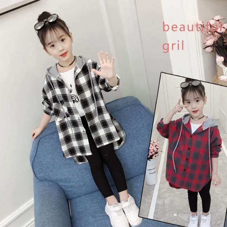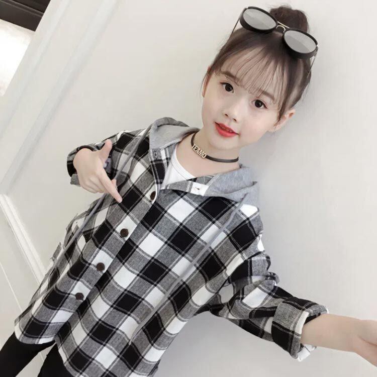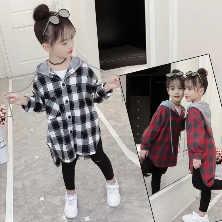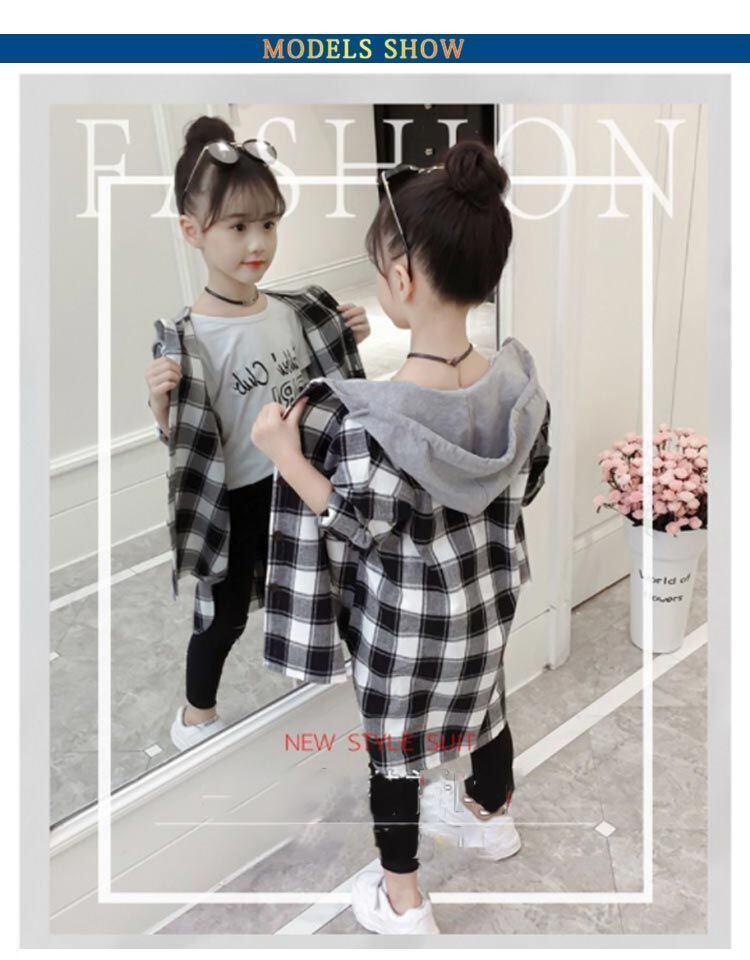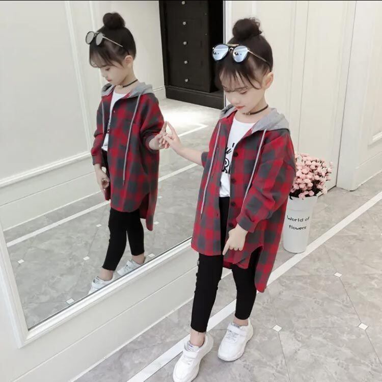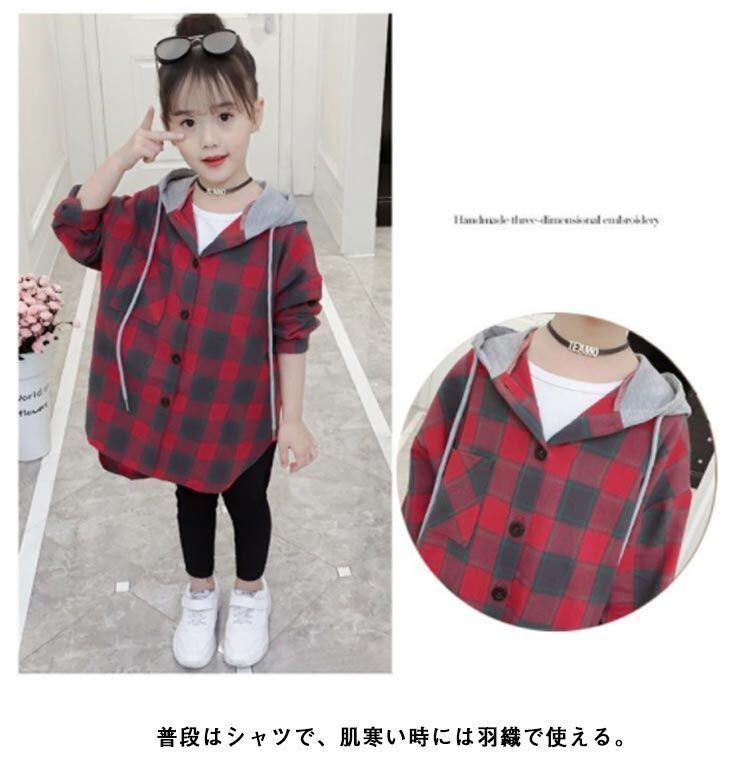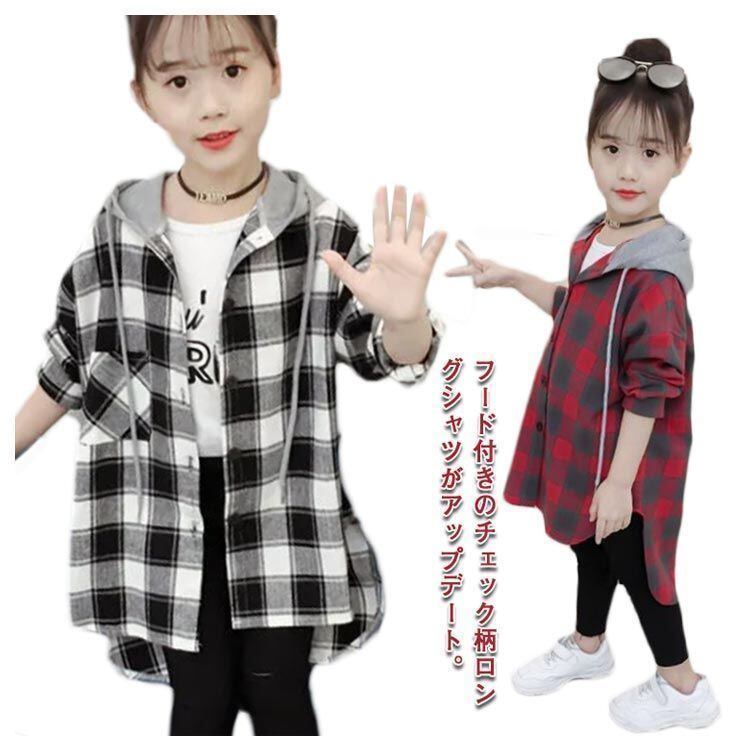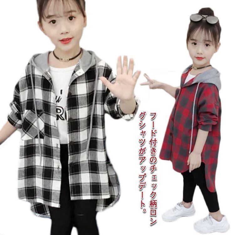 新品 ロングシャツ チェックシャツ フード付き 長袖シャツ 子供服 キッズ ロングチェックシャツ 女の子 羽織り ガールズ 女児 ダンス衣装 ジュニア服 可愛い 110cm 120cm 130cm 140c kkkyyj