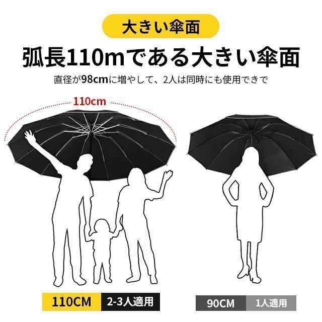 【大きい傘面】折り畳み傘を広げると直径98cm、弧長110cm、傘を傾けても垂直に差しても体が濡れにくく。