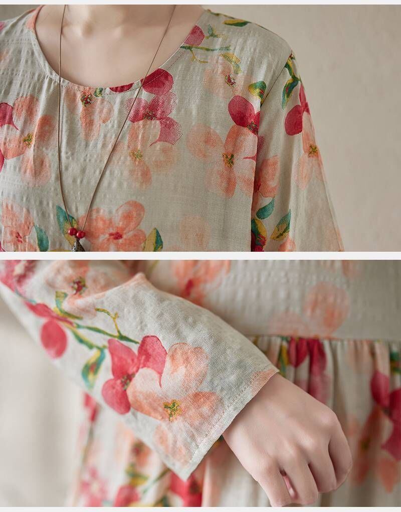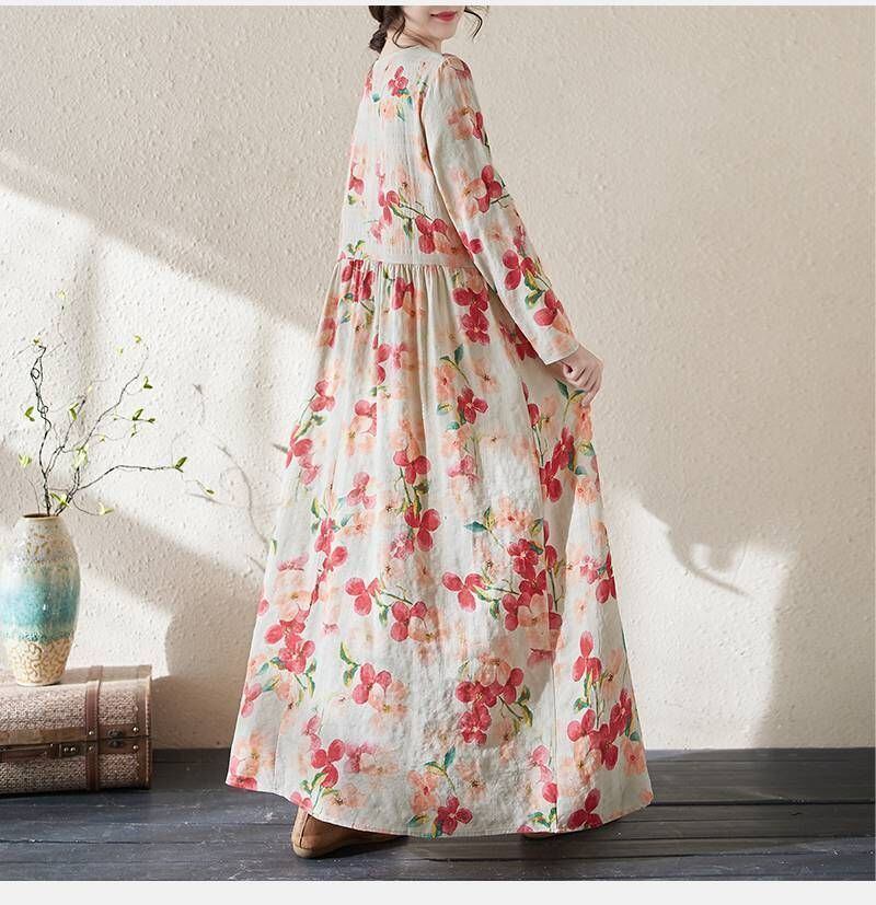 新品 ロングワンピース ワンピース レディース 綿麻 春 夏 秋 花柄 体型カバー ゆったり 長袖 Uネック フレアワンピース 柔らかい Aライン ハイウエスト きれいめ おしゃれ 韓国ファッション kkkvet
