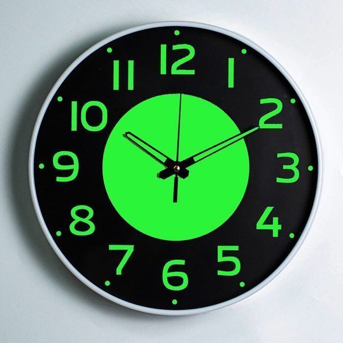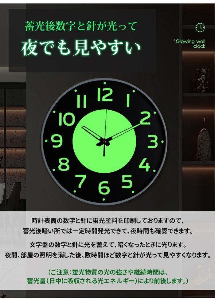 文字盤の数字と針に光を蓄えて、暗くなったときに光ります。夜間、部屋の照明を消した後、数時間数字と針が光って見やすくなります。