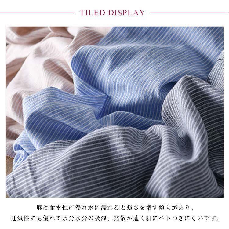 麻は耐水性に優れ水に濡れると強さを増す傾向があり、通気性にも優れて水分水分の吸湿、発散が速く肌にベトつきにくいです。