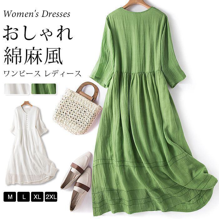 ワンピース レディース 綿麻風 五分袖 半袖 ロング丈 ロングワンピース Vネック リネン混 夏 無地 カジュアル 体型カバー きれいめ 通勤 OL シンプル ゆったり おしゃれ リゾートabm110