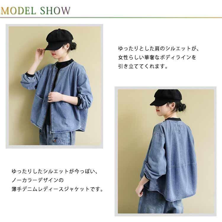 ゆったりしたシルエットが今っぽい、ノーカラーデザインの薄手デニムレディースジャケットです。