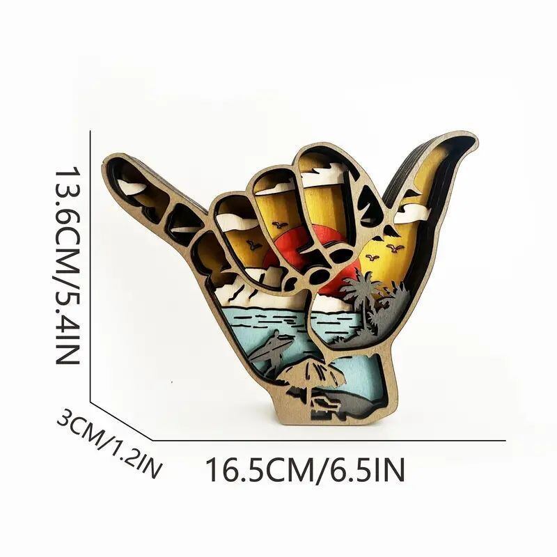 このユニークな木製デコレーションは、ハワイアンなサンセットビーチをテーマにした美しいデザインが特徴です。立体的な手のジェスチャー(シャカサイン)に、夕日、ビーチ、ヤシの木、海をモチーフにしたカラフルなシーンが描かれています。16.5cm x 13.6cm x 3cmのコンパクトなサイズで、デスクトップやリビングルーム、寝室の装飾として最適です。
