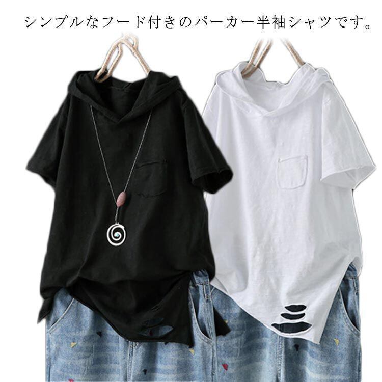 新品 tシャツ パーカー レディース トップス ブラック 半袖 フード付き シンプル パーカーtシャツ パーカ プルオーバー カットソー ホワイト 半袖tシャツ 春服 夏服 薄手 kkksdz