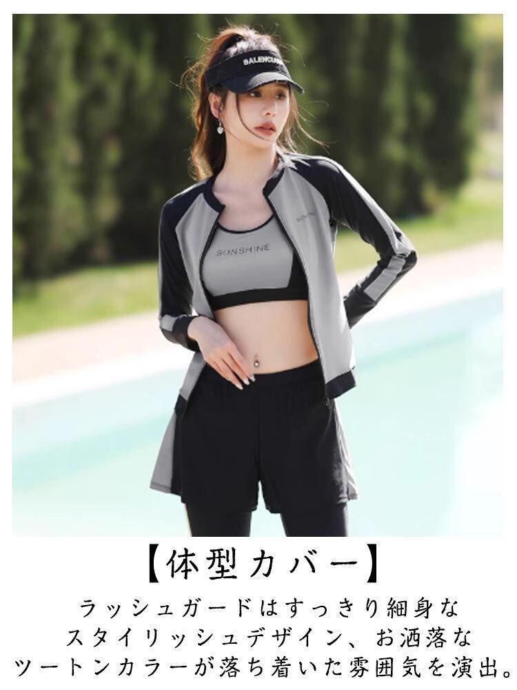【水着豪華5点セット】ラッシュガード+ショートパンツ+レギンス+ブラ+ショーツ、使いやすく着回しがしやすい女性用水着5セットで、届いたらすぐに使えます。シンプルなカラーデザインなので着回しは自由自在、シーンに合わせて違った着回しをたのしむことができます!