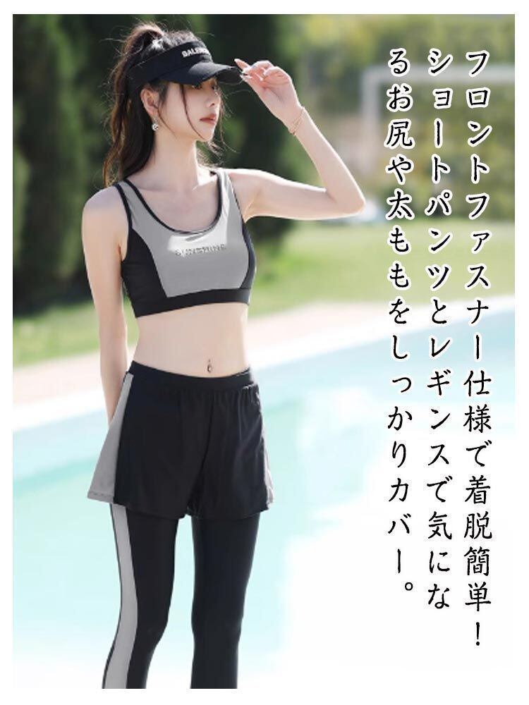 【体型カバー】ラッシュガードはすっきり細身なスタイリッシュデザイン、お洒落なツートンカラーが落ち着いた雰囲気を演出。フロントファスナー仕様で着脱簡単!ショートパンツとレギンスで気になるお尻や太ももをしっかりカバー。レギンスにこだわりにこだわった無地と柄の切替ラインで、着た瞬間魔法のように細く見えちゃう!