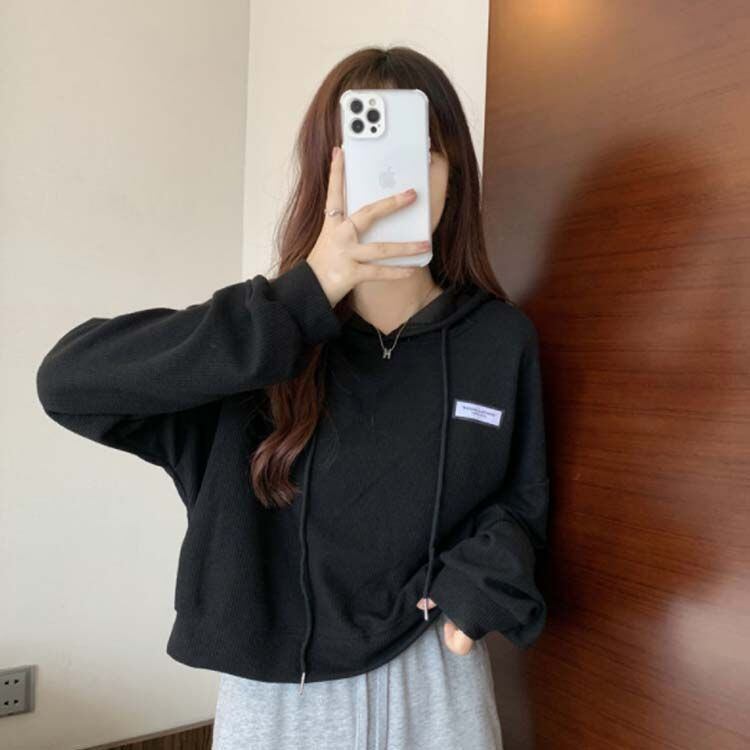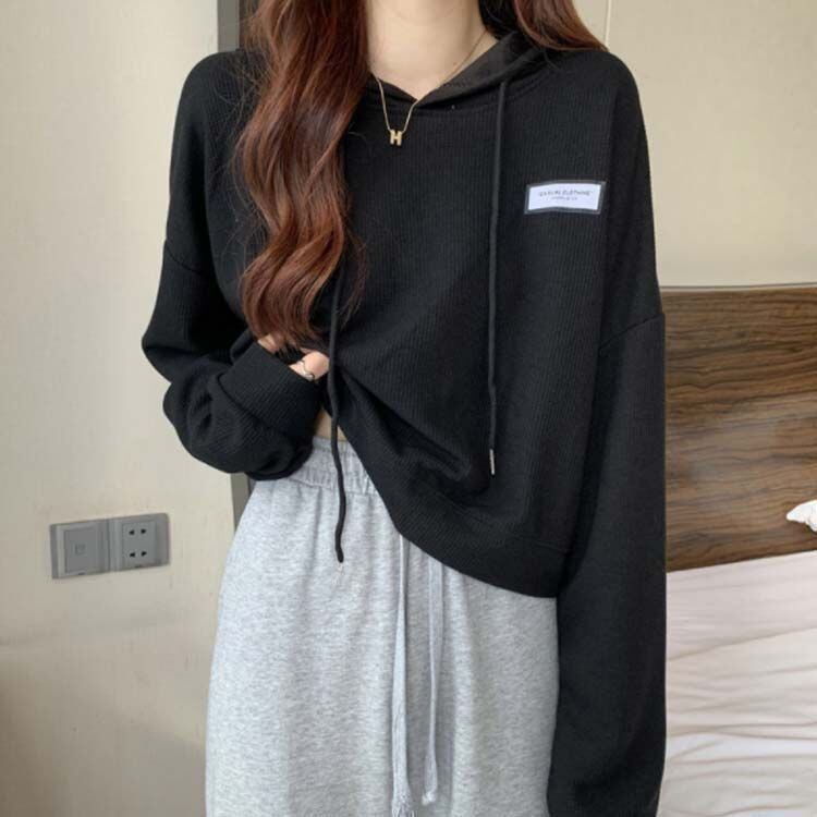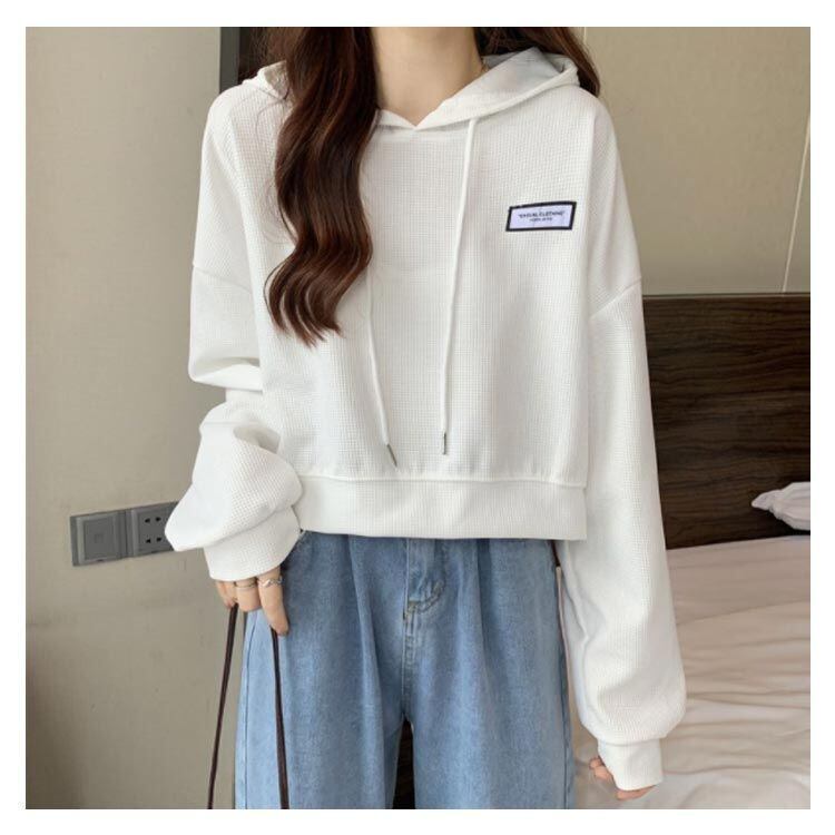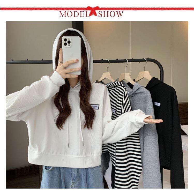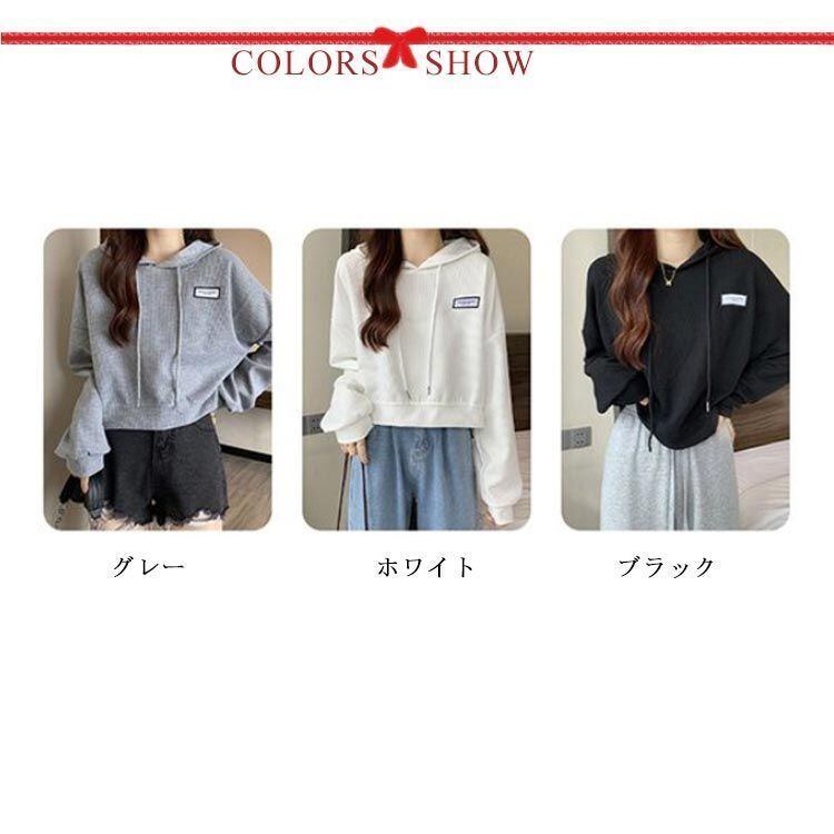 新品 3色展開 レディース パーカー クロップド丈 長袖 トレーナー ショート丈 春秋 トップス 薄手 プルオーバー ワッフル ゆったり 無地 カジュアル おしゃれ 韓国ファッション kkkgup