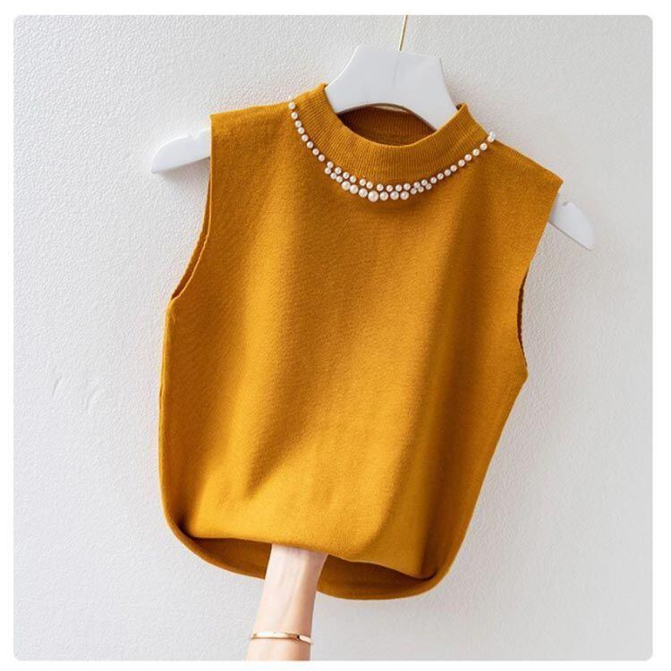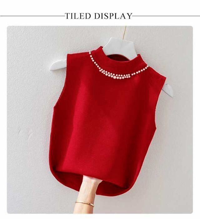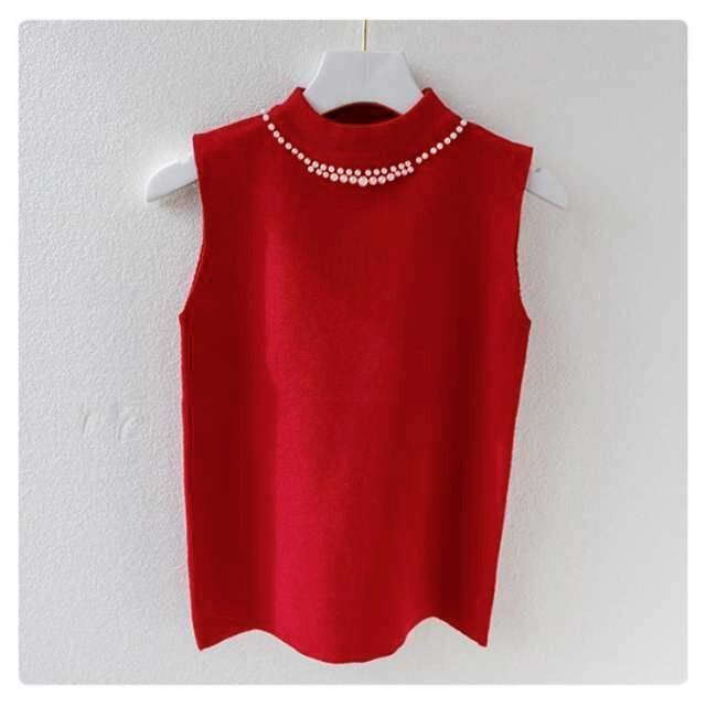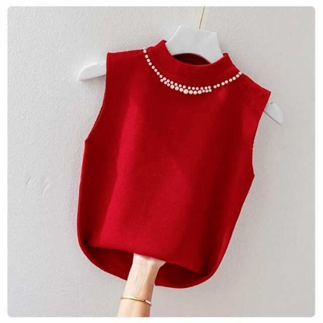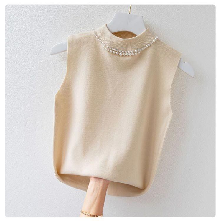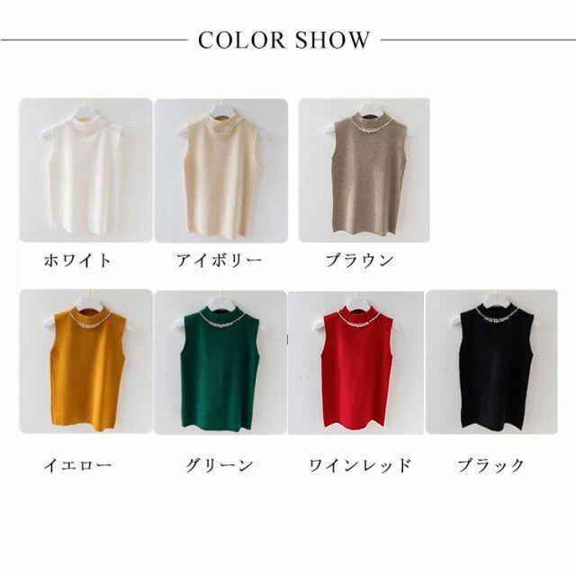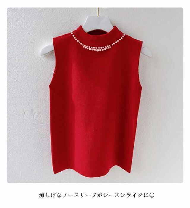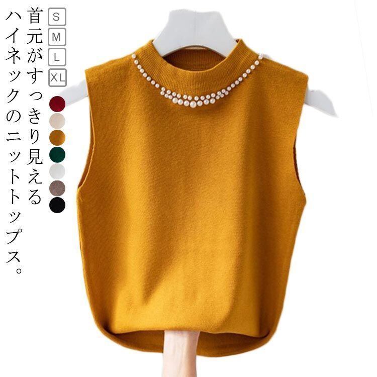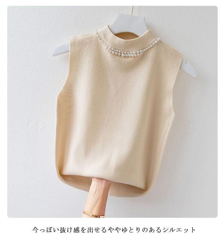 新品 ノースリーブ ニットトップス リブニット パール付き ニットベスト トップス サマーニット ハイネック タートルネック スリム フィット 春 夏 秋 ニットタンクトップ 無地 フェミニン きれいめ 大 kkktjp