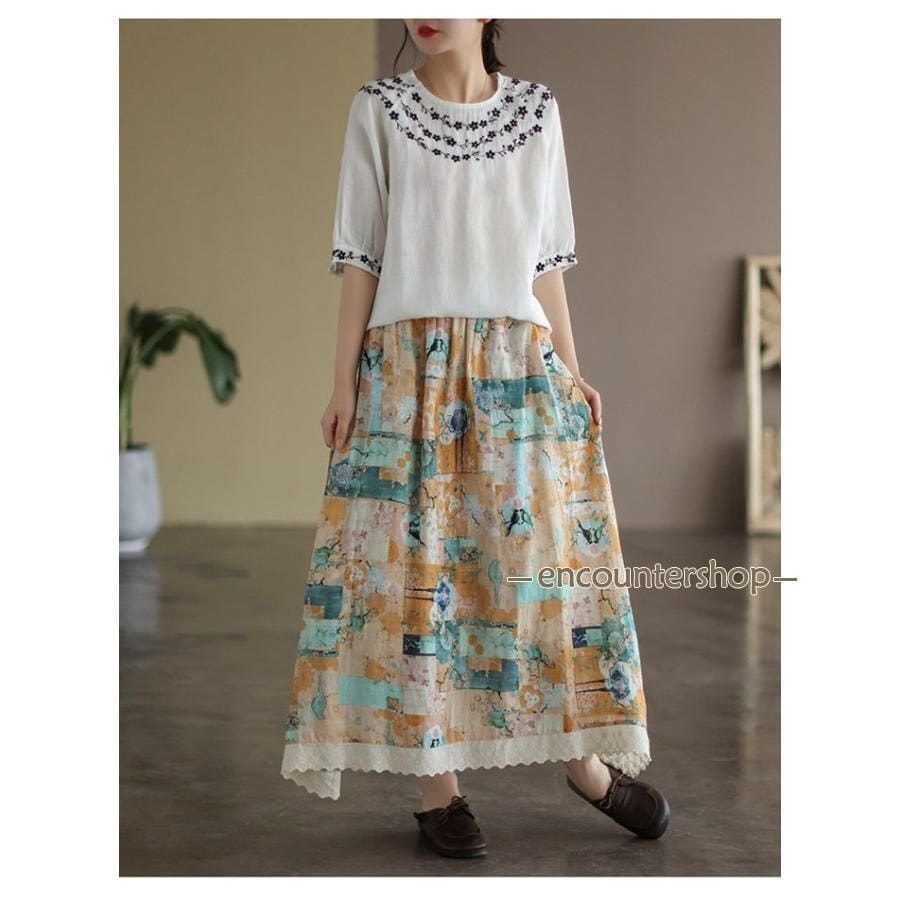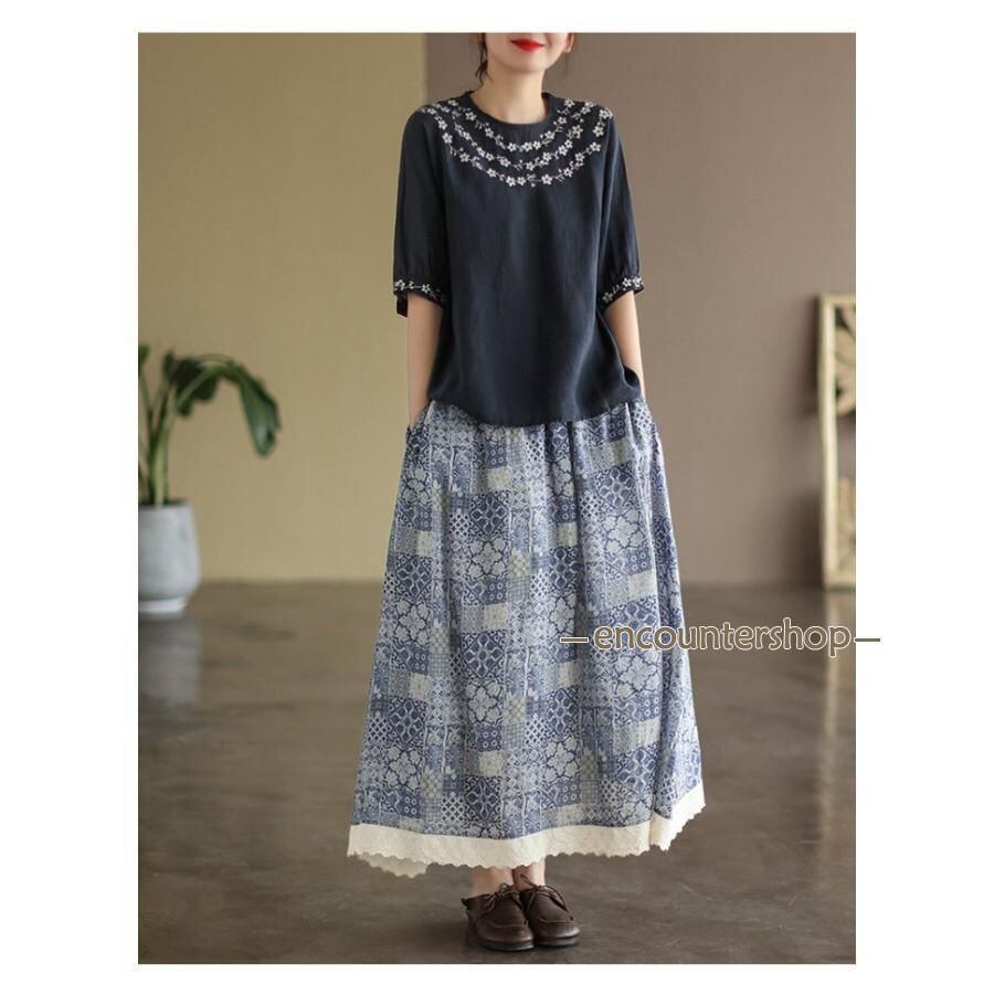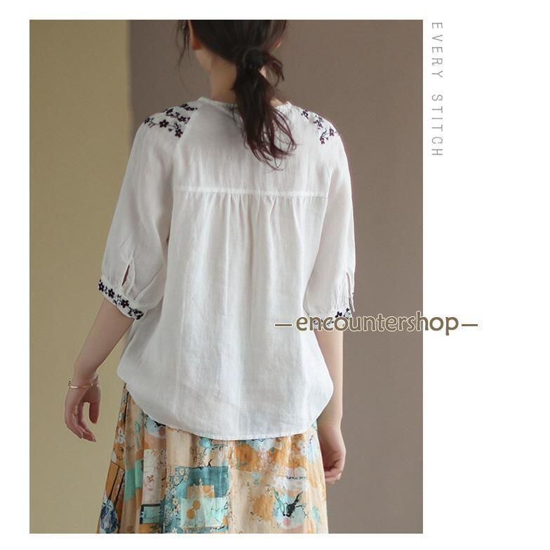 新品 Tシャツ チュニック レディース ブラウス 綿麻風 刺繍 半袖 五分袖 花柄 春 夏 コットン リネン エスニック 森ガール kkkyyd