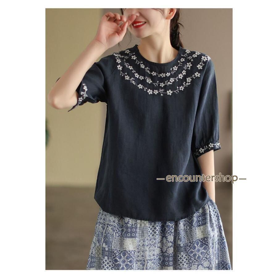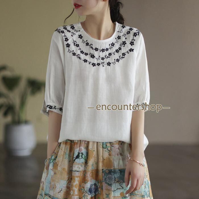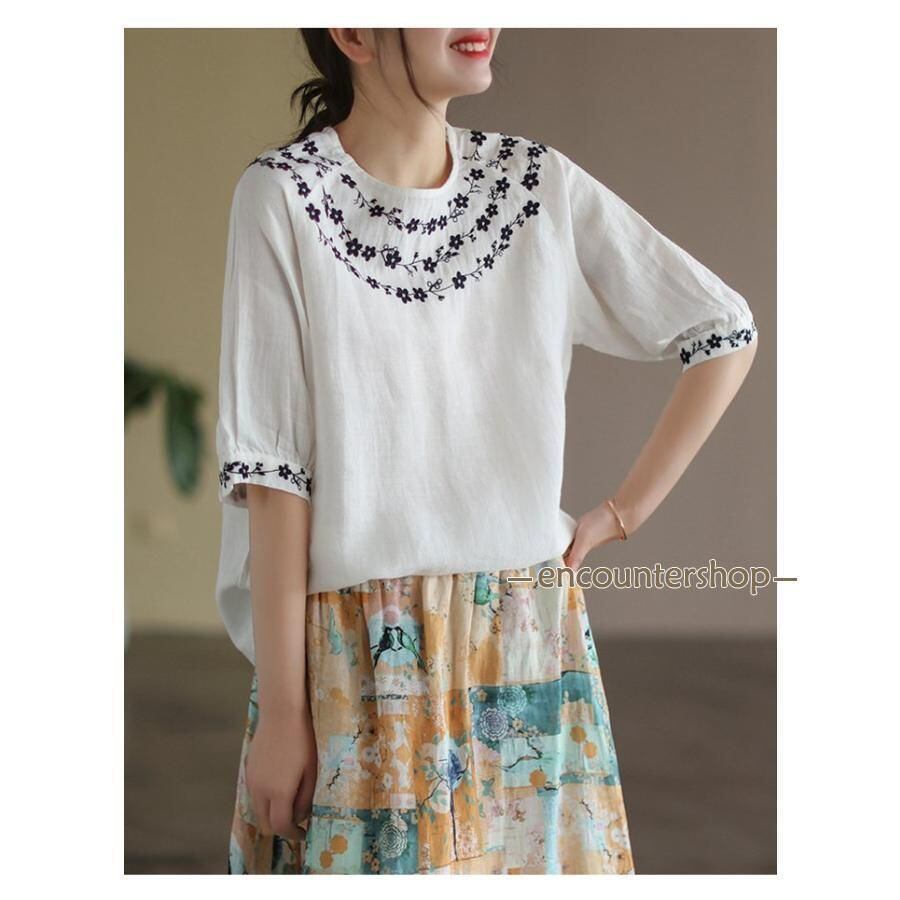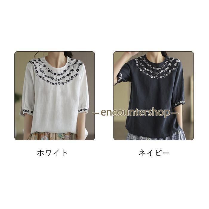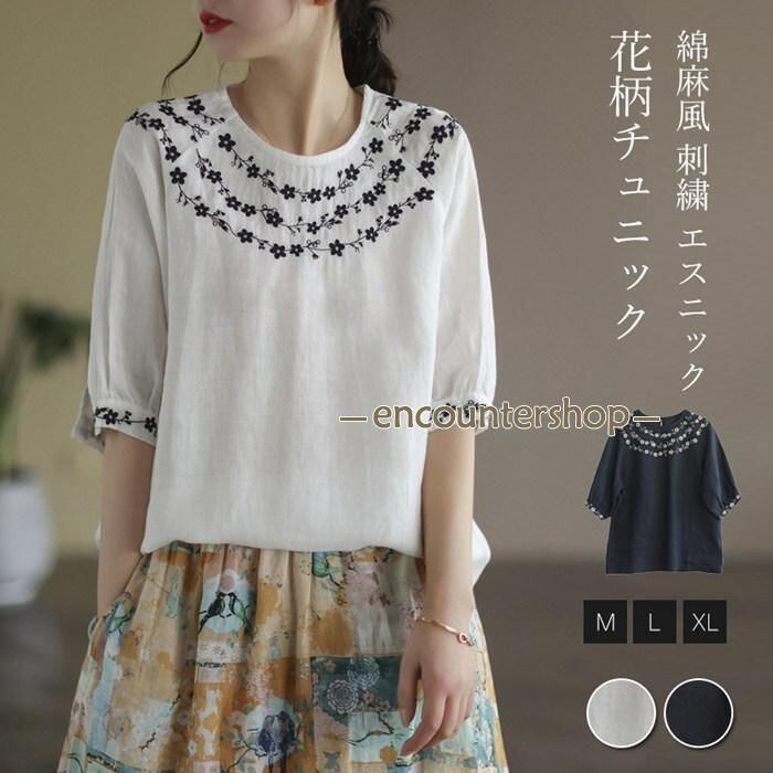 Tシャツ チュニック レディース ブラウス 綿麻風 刺繍 半袖 五分袖 花柄 春 夏 コットン リネン エスニック 森ガール 大人可愛い 薄手 カットソー ゆったり おしゃれ エレガント ファッション ホワイト ネイビー