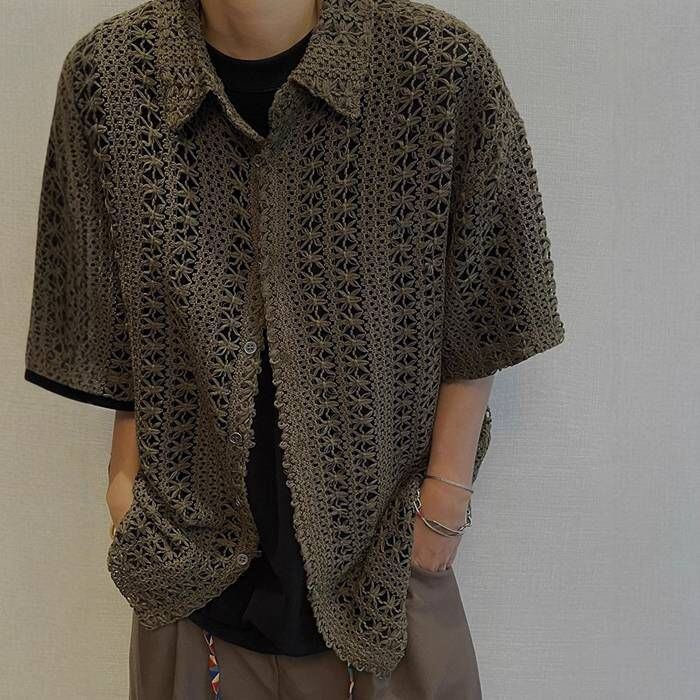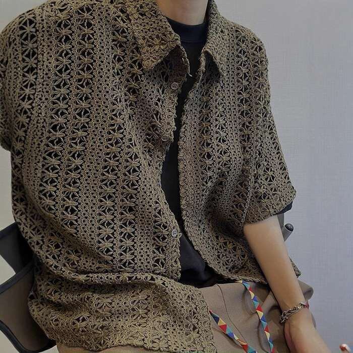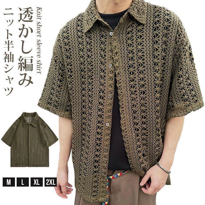 透かし編み ニット半袖シャツ メンズ サマーニット トップス 無地 薄手 デザイン 編みシャツ レース編み メッシュ ビッグサイズ オーバーサイズ 襟付き 洒落 カジュアルシャツ ストリート ファッション 開襟 ゆったり 半袖 アロハシャツ 薄手 快適 かっこいい