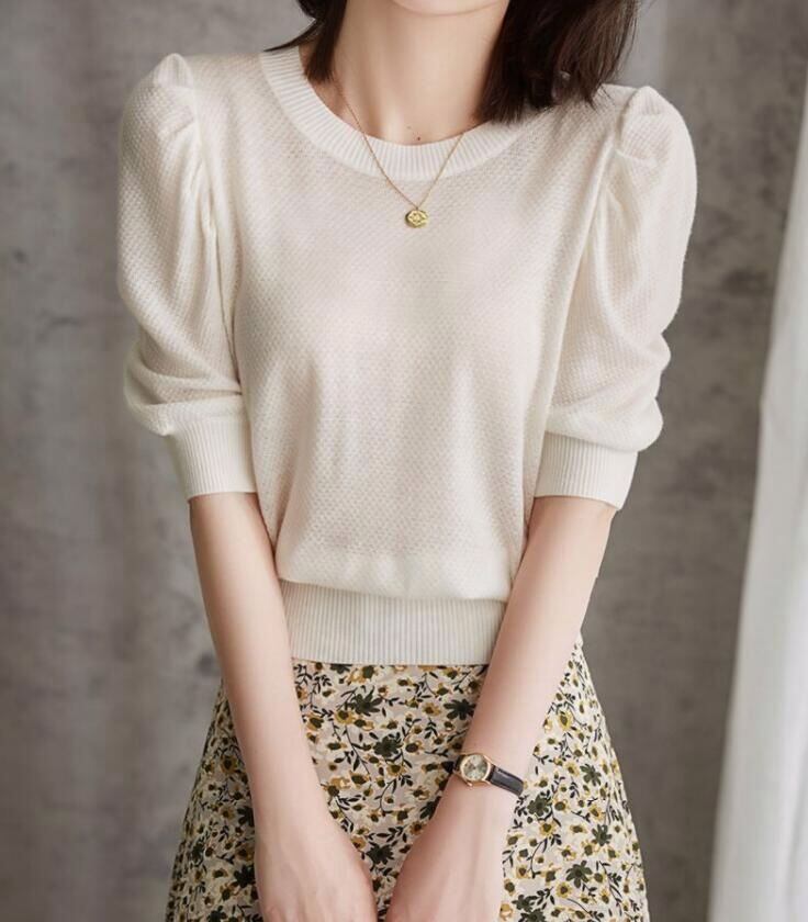 ニットTシャツ パフスリーブ レディース 半袖 Uネック シンプル ニット トップス カットソー サマーニット キレイめ 大人 カジュアル 半袖 レディース きれいめ オフィス カジュアル 20代 30代 40代