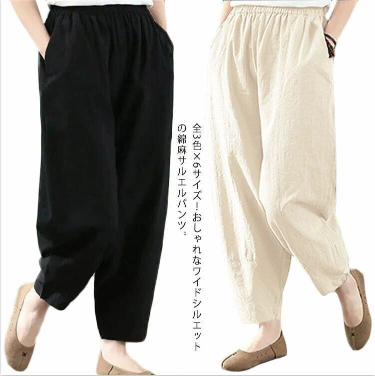 全3色×6サイズ!おしゃれなワイドシルエットの綿麻サルエルパンツ。