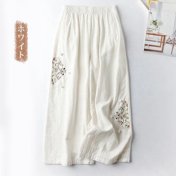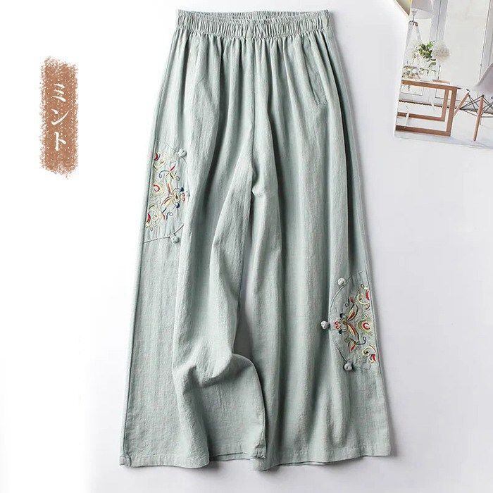 ワイドパンツ 刺繍入り 綿麻風 レディース ゆったり ガウチョパンツ 女性 麻風 コットンリネン ワイド 涼しい パンツ 刺繍 無地 ウェストゴム 体型カバー 快適 ゆる感 楽ちん