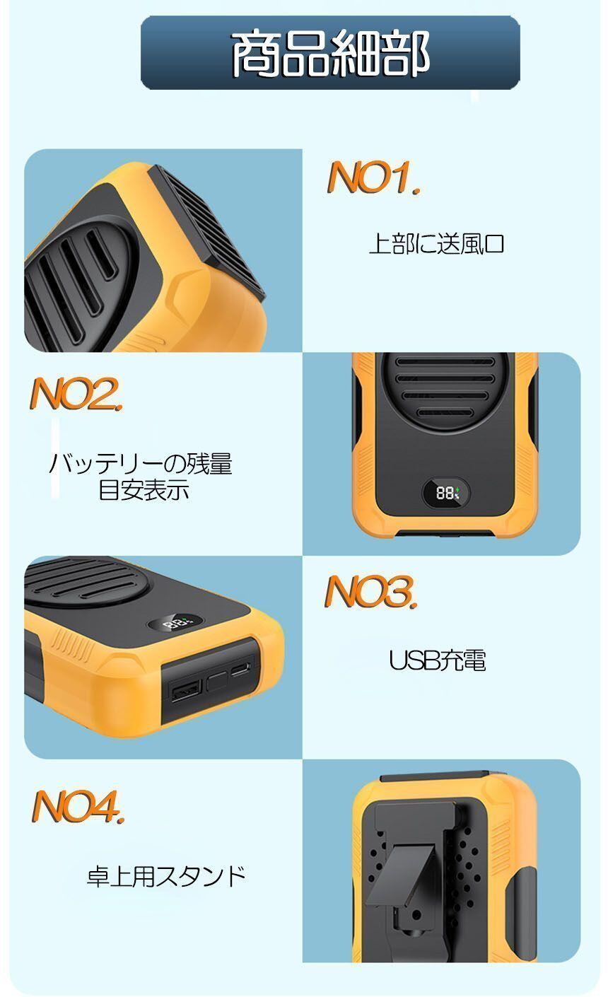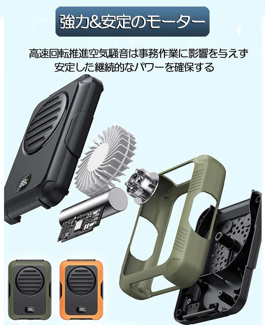 【2000mAh \u0026 USB充電式】 2000mAh大容量リチウムポリマー電池を採用して、フル充電完了後、1段階目の自然風で約8時間使用できます。腰掛けファンはUSB充電式タイプです。