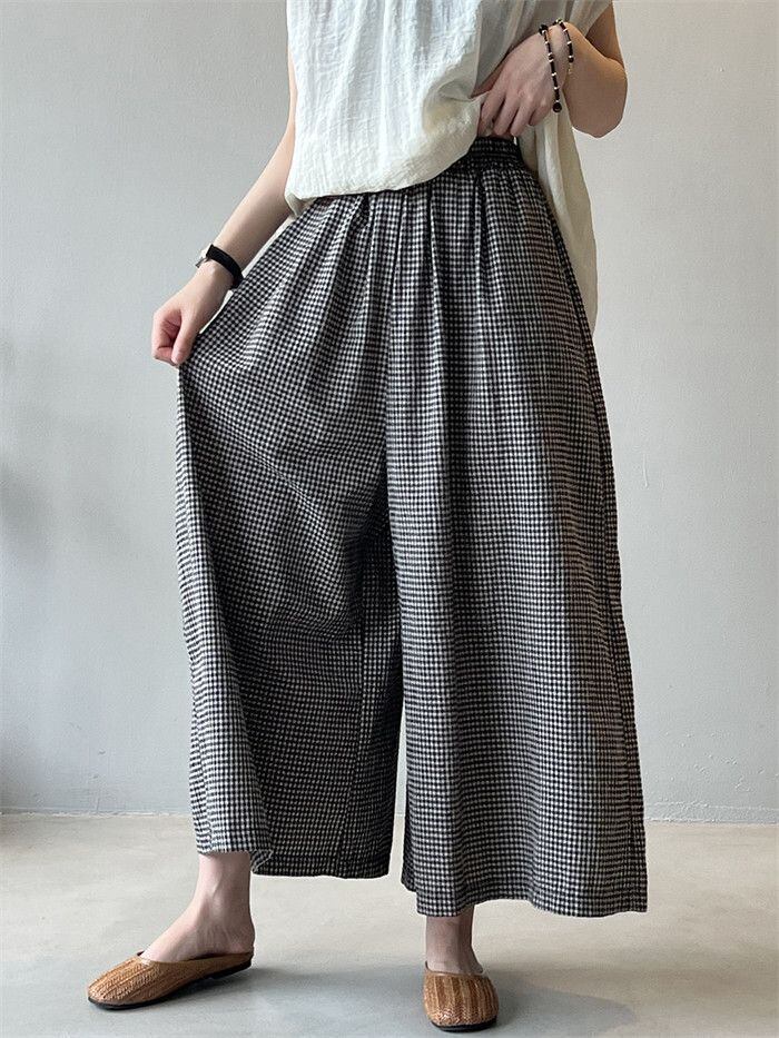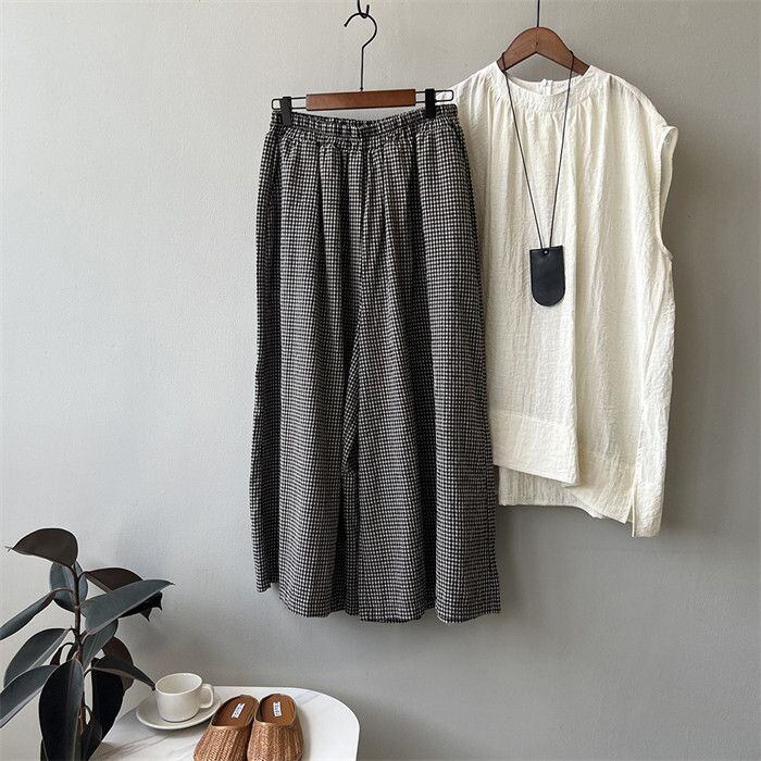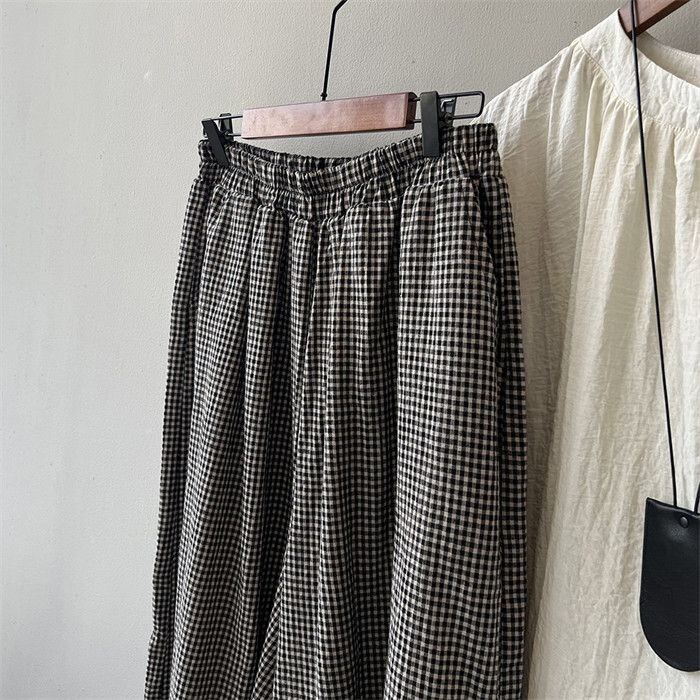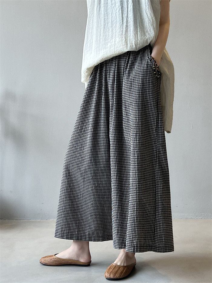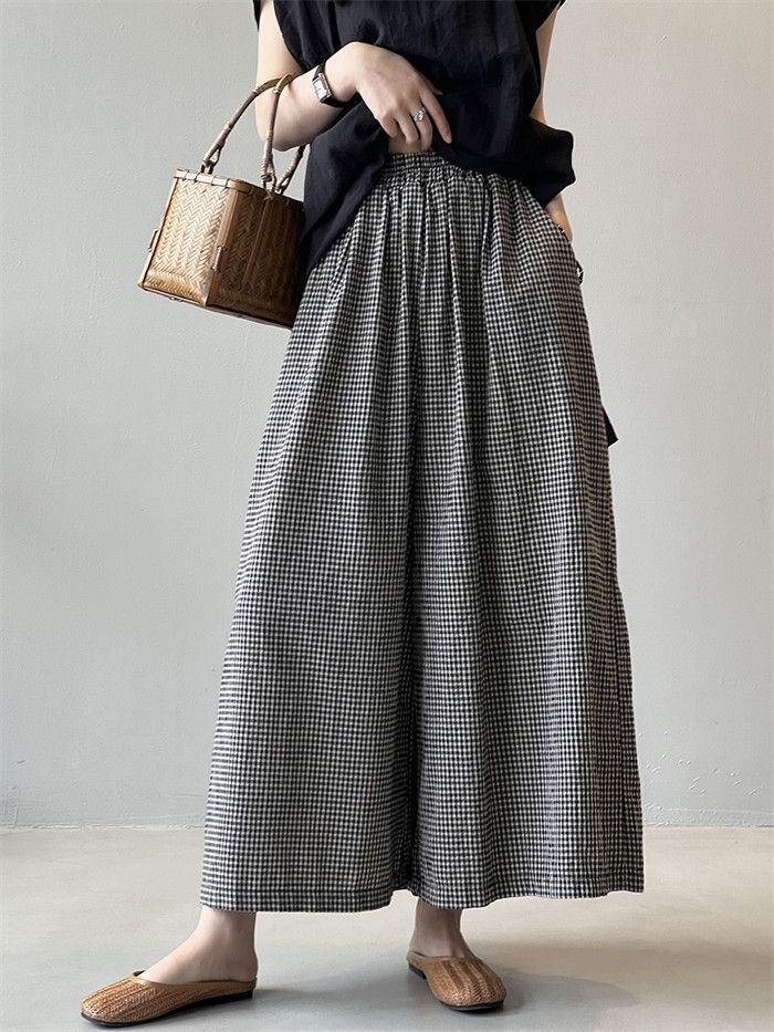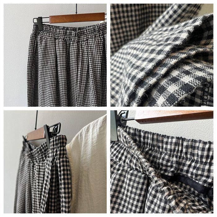 新品 ワイドパンツ ギンガムチェック 夏 レディース パンツ ガウチョパンツ 綿麻風パンツ チェック ウエストゴム フレアパンツ ズボン ボトムス kkkydk