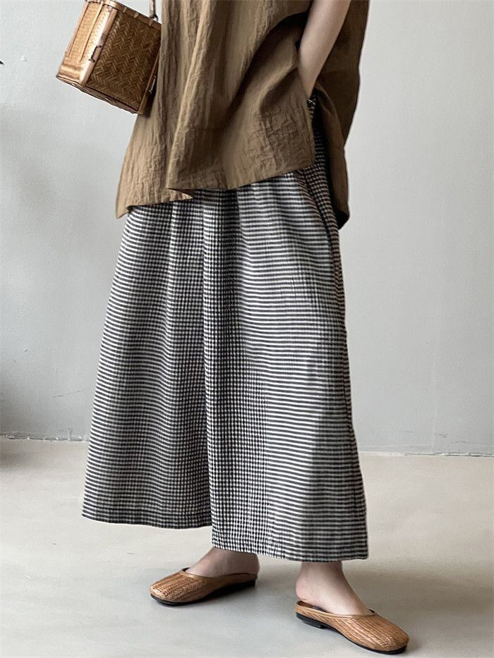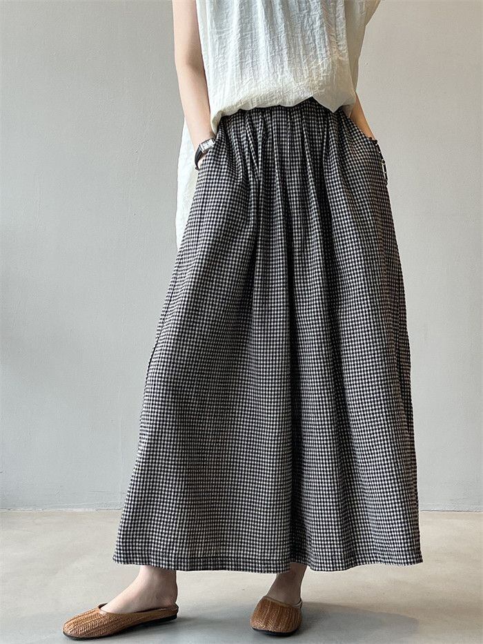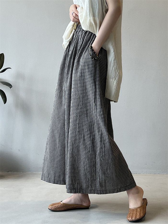 ワイドパンツ ギンガムチェック 夏 レディース パンツ ガウチョパンツ 綿麻風パンツ チェック ウエストゴム フレアパンツ ズボン ボトムス