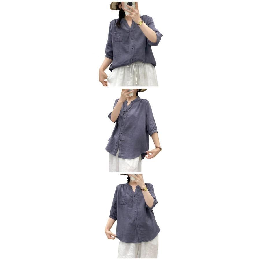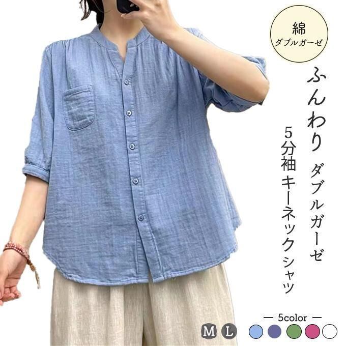 新品 ダブルガーゼ 5分袖 キーネック レディース トップス 綿 春 夏 秋 M L ハーフ袖 着心地いい ゆったりサイズ ギャザー開き ハーフスリーブ kkkzre