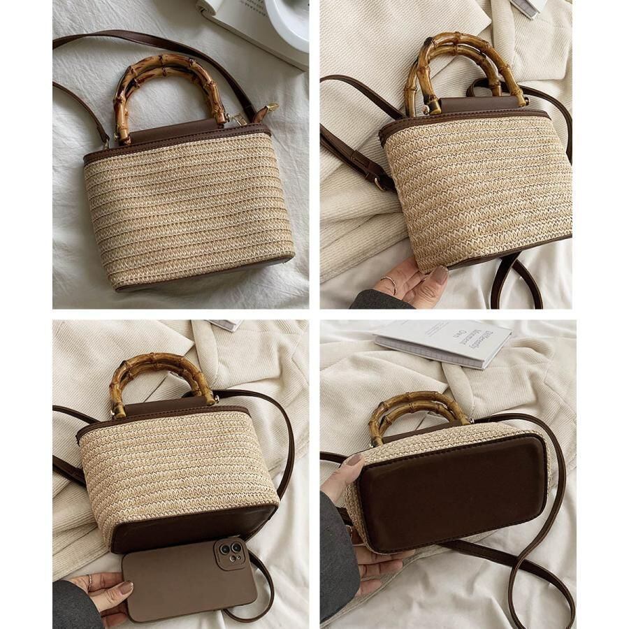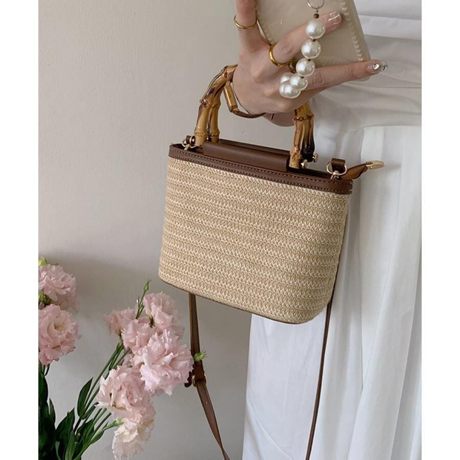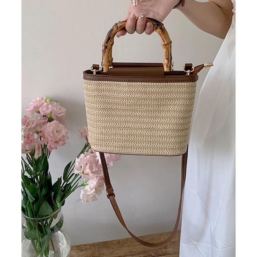 夏っぽい麦わら素材とフェイクレザーがカジュアルになり過ぎず、小さめで持ち運びも楽々