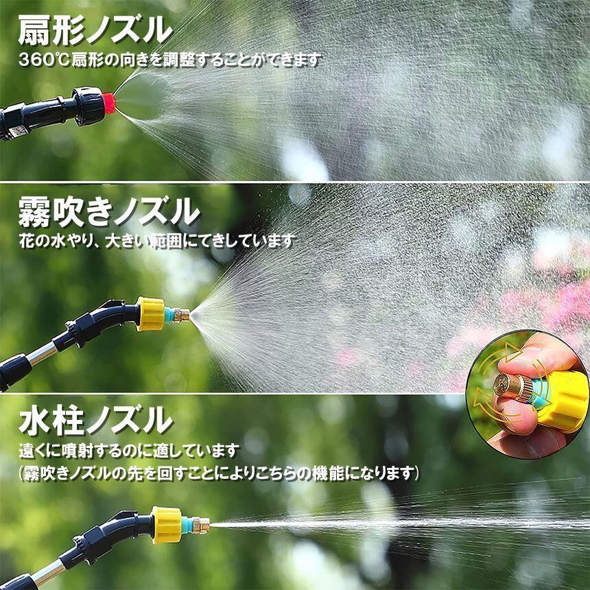 ノズル2 ファンノズル、扇状。噴霧方向は360°調整可能。 スプレー効果を自由に調整でき、散水に便利で花や植物を傷めません。