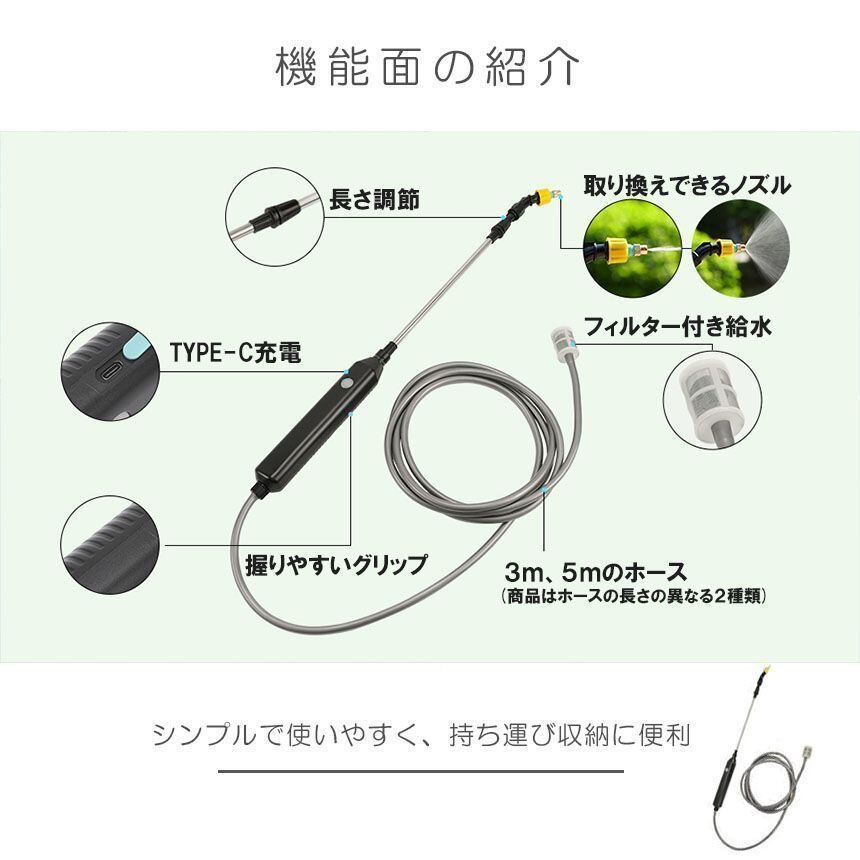 新品 噴霧器 電動 電動噴霧器 伸縮 充電式 霧吹き 軽量 選べるホースの長さ ポータブル Type-C充電 2種類のノズル 吸水ホース 園芸水やりなど 家庭の掃除 kkksuy