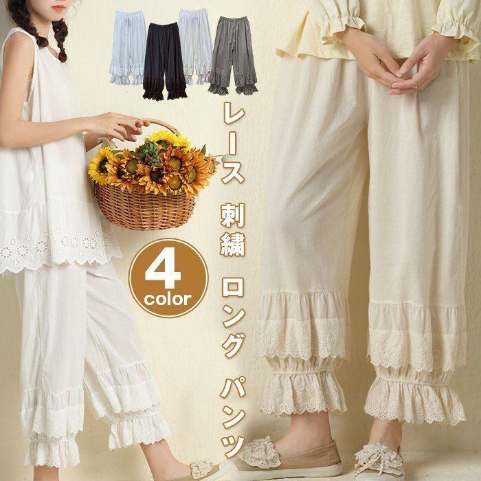新品 ペチパンツ レース 刺繍 ロング パンツ インナー 透け 防止 レディース ナチュラル 裾ゴム ゆったり 大きめ 楽 涼しい 春 夏 秋 かわいい kkktqb