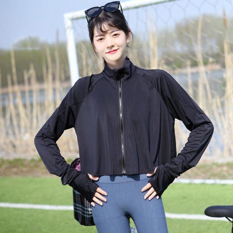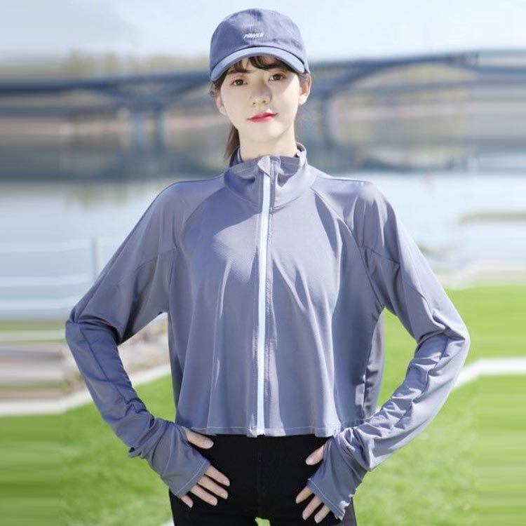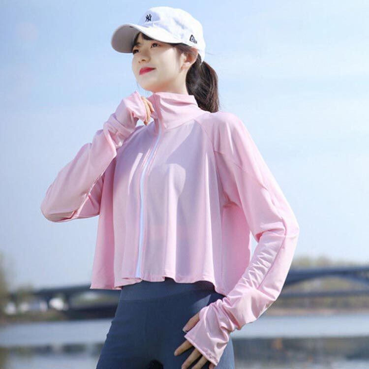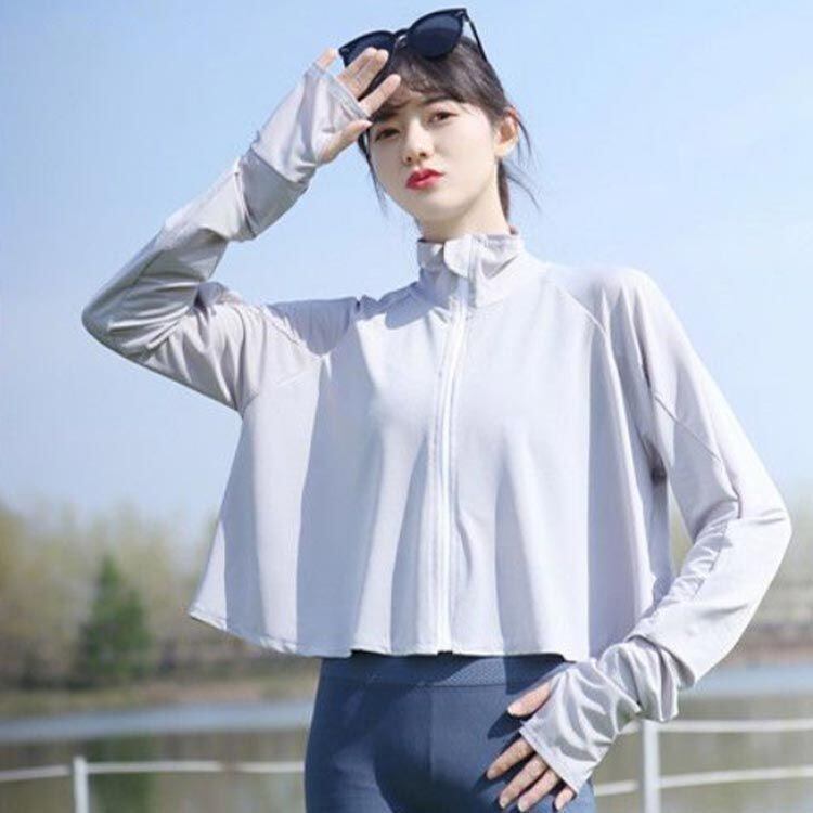 紫外線から肌を守るフードなしのジップアップパーカー。