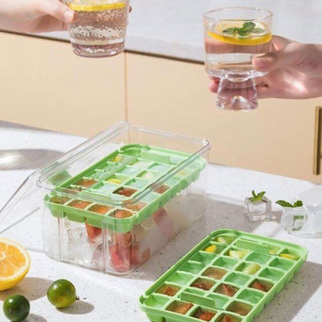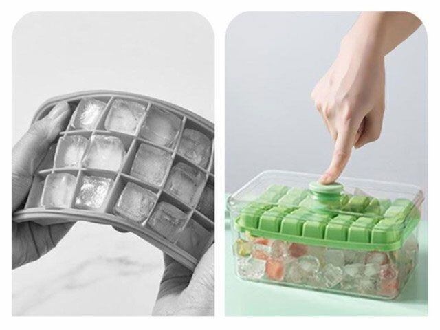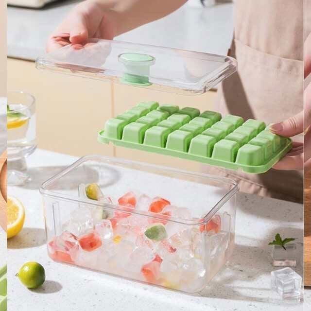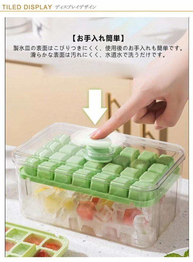 【革新的なデザイン】製氷皿はプッシュボタンで設計されており、凍った氷の収納部をひっくり返して蓋の中央部分を押すだけで、簡単に氷が取り出せます。 ワンクリックで氷が取れます。