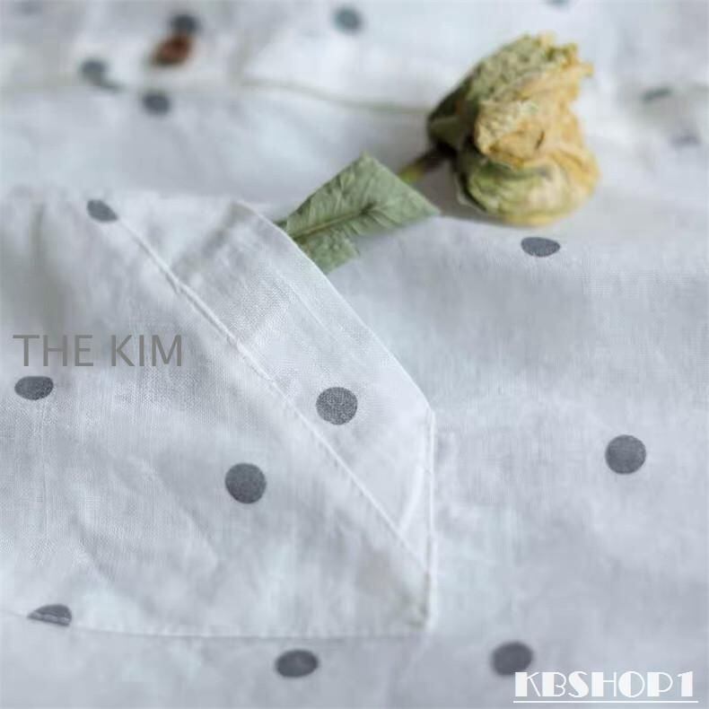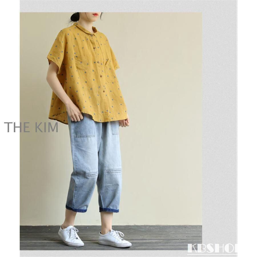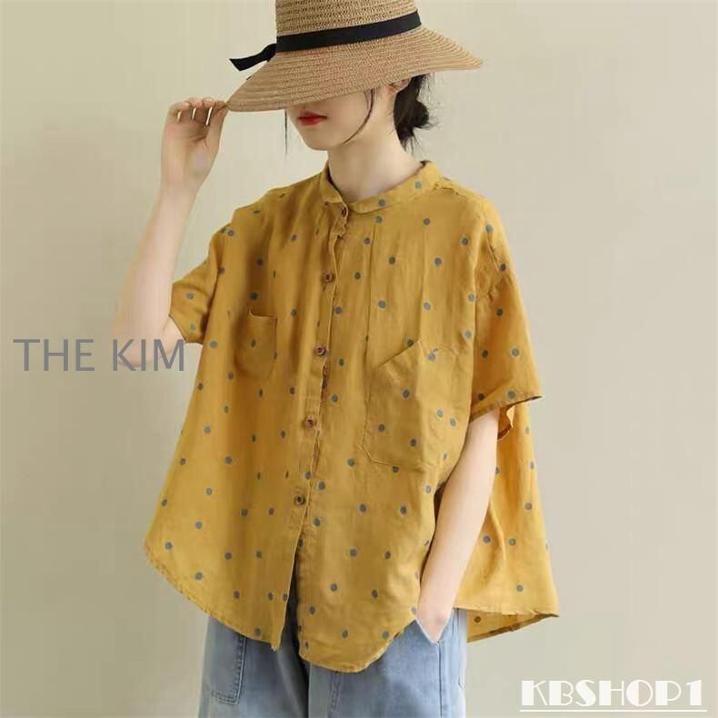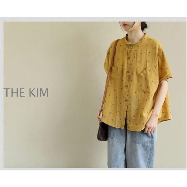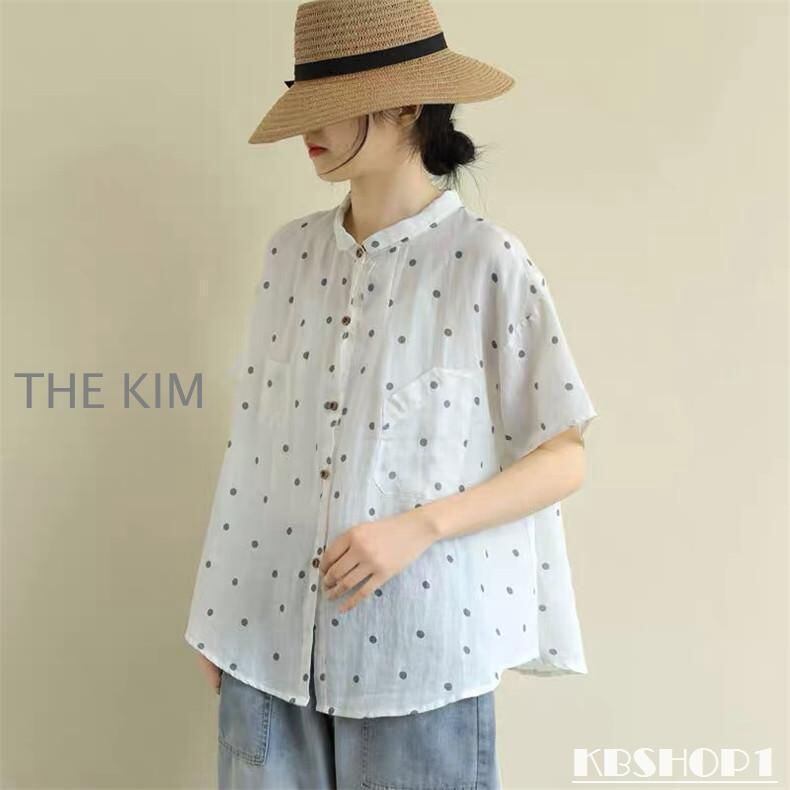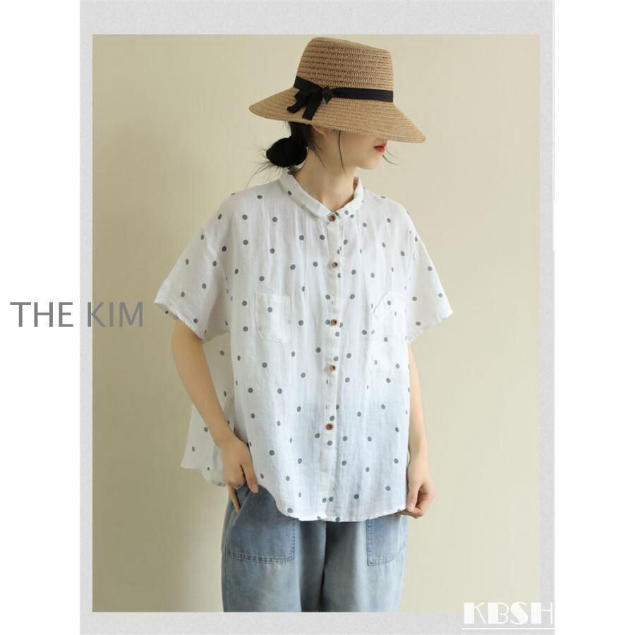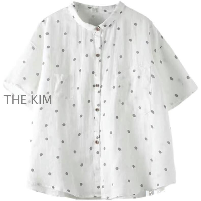 新品 シャツ 綿 半袖 水玉柄 レディース 通気性がいい 前開き ボタン留め 折り襟 ゆったりとしたシルエット ドルマンシャツ 夏 いろんなシーンで kkkjtm
