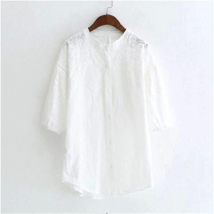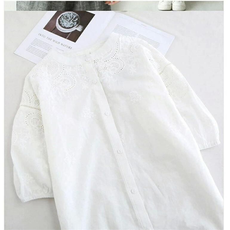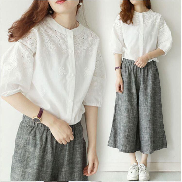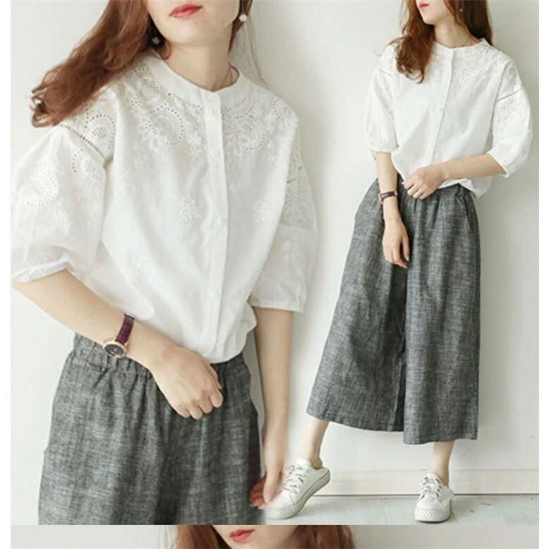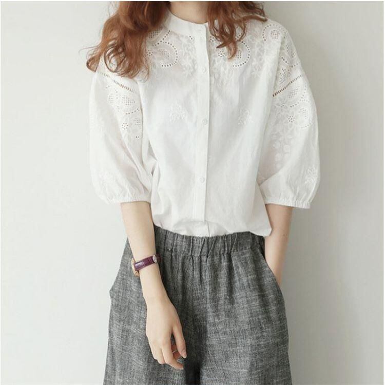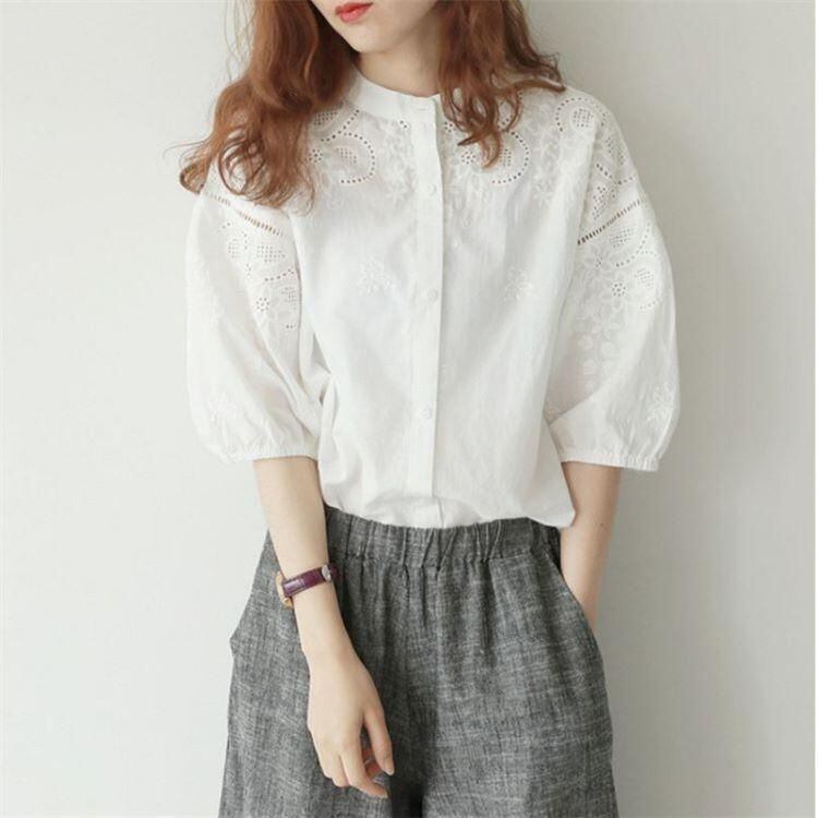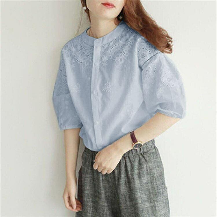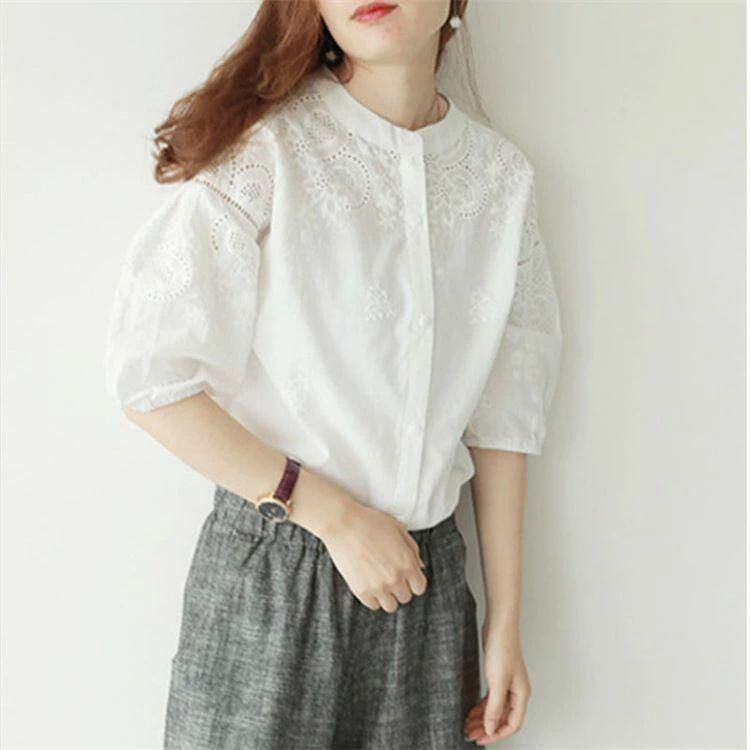 新品 ブラウス 刺繍 レース 長袖 シャツ レディース シャツブラウス 白シャツ スタンドカラー 五分袖 立ち襟 バンドカラー ボリューム袖 シャツ kkkida