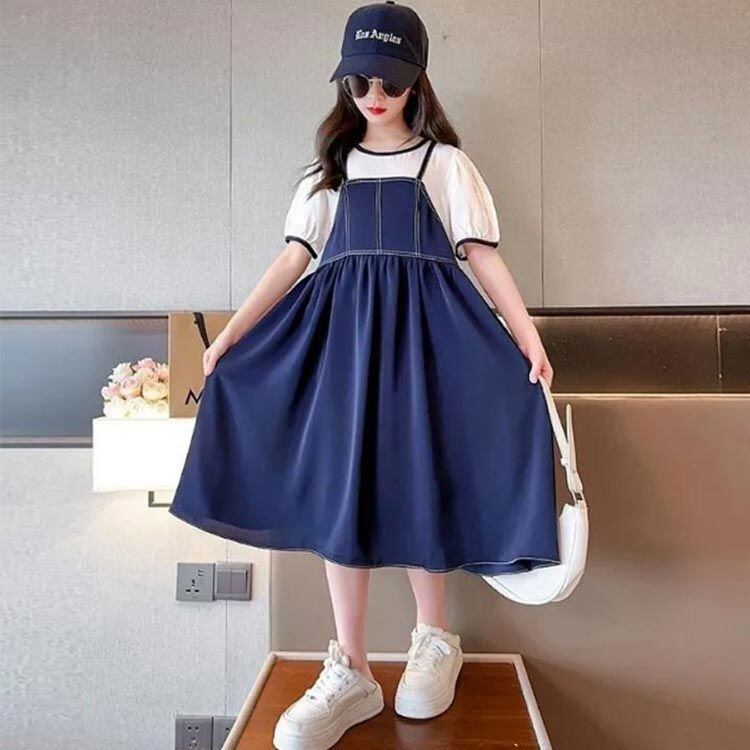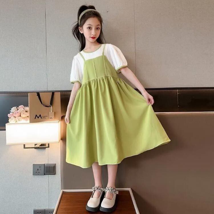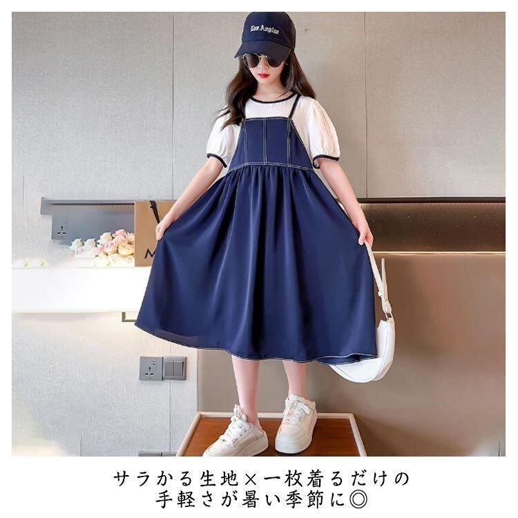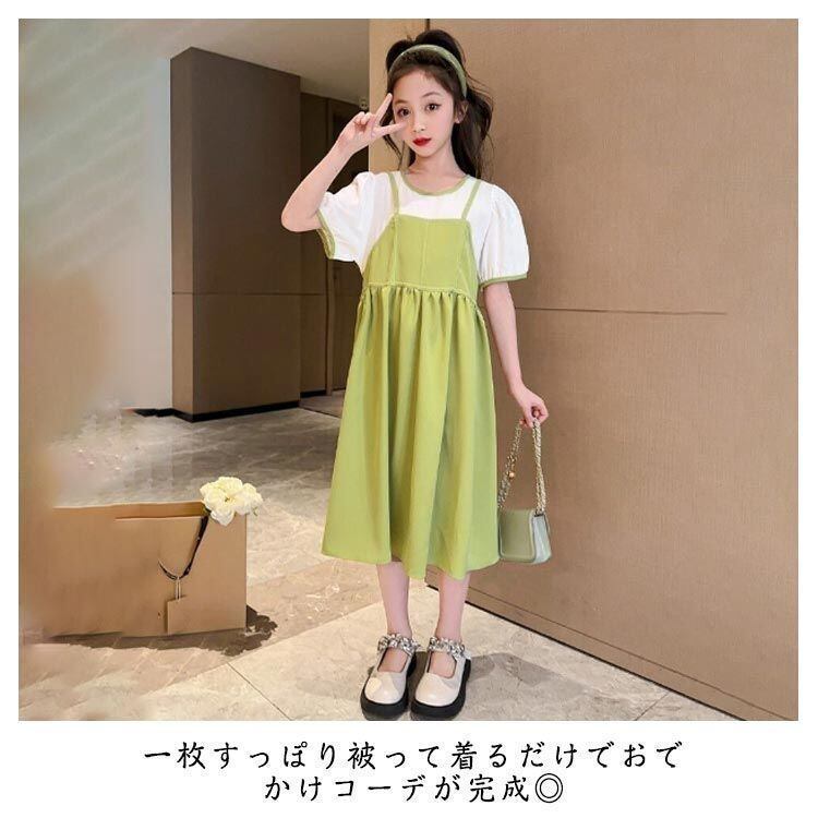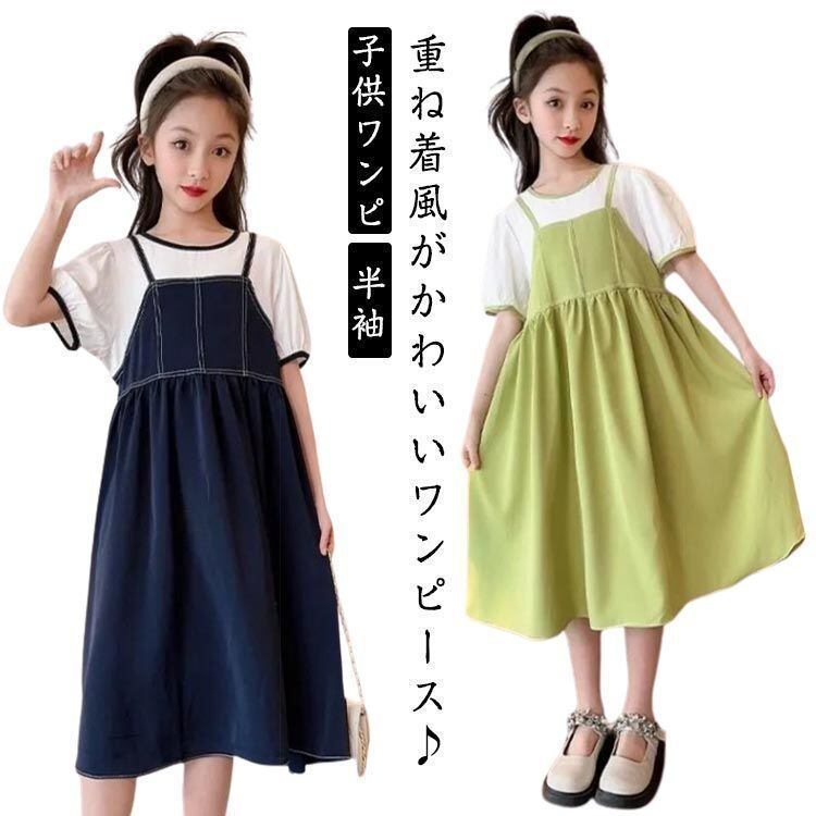 新品 子供ワンピ 半袖 ワンピース 女の子 レイヤード風 夏用 ロングワンピース 重ね着風 ドッキングワンピース 韓国子供服 ゆったり きれいめ 大きいサイズ 薄手 涼しい 通学 通園 入学 入園 七五三 kkkkkq