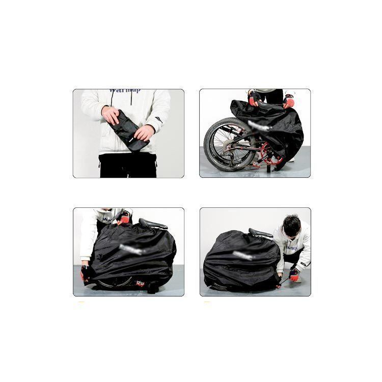 【使用方法】?収納袋を開く;?自転車のサドルを上部開口部に通す;?自転車をほぼ完全に覆う;?底のゴムバンドを締める。