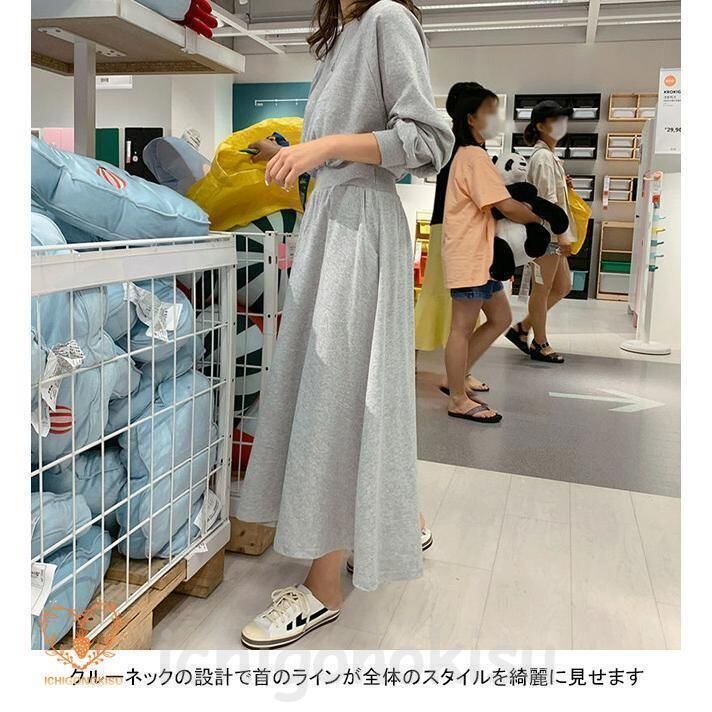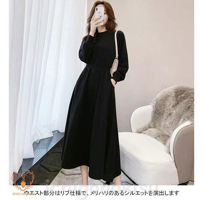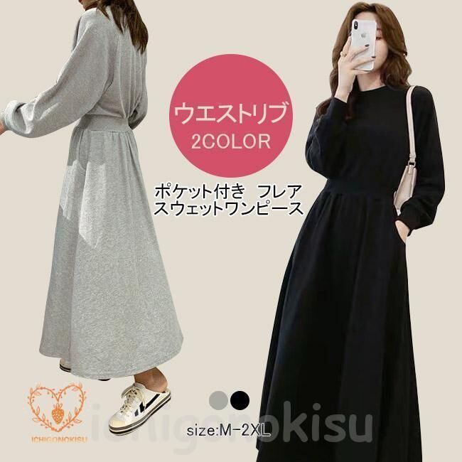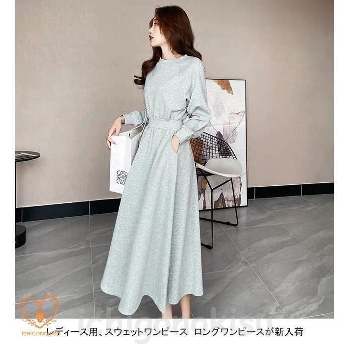 新品 ロングワンピース レディース スウェットワンピース クルーネック 長袖 フレア ウエストリブ ポケット 柔らかい ゆったり 着回し 秋冬 kkkcmc